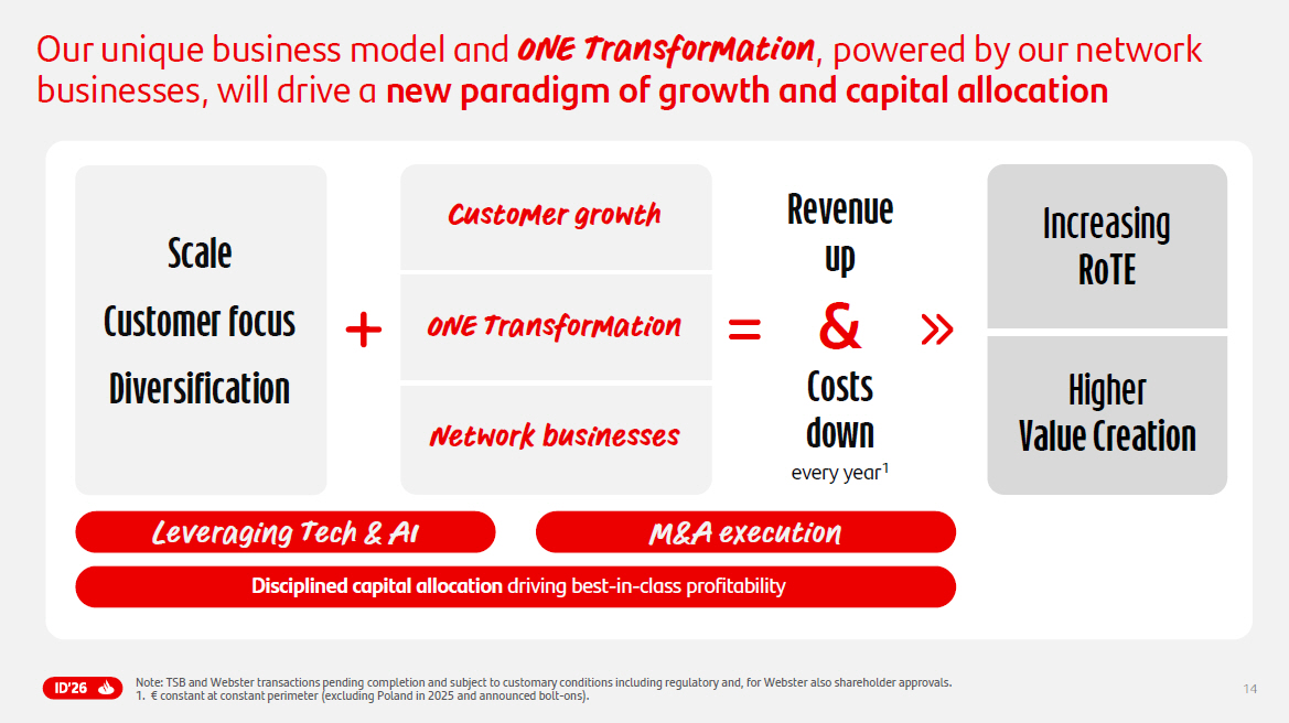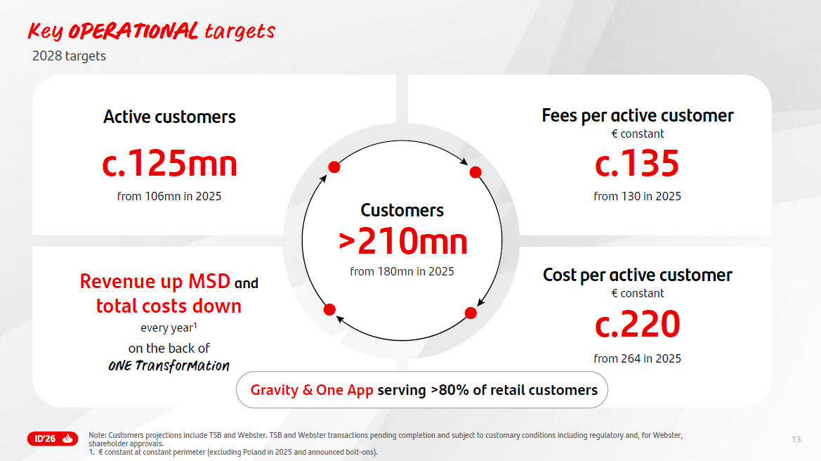 13 13 Key OPERATIONAL targets 2028 targets Active customers c.125mn from 106mn in 2025 Fees per active customer € constant c.135 from 130 in 2025 Customers >210mn from 180mn in 2025 Revenue up MSD and total costs down every year 1 on the back of ONE Transformation Cost per active customer € constant c.220 from 264 in 2025 Gravity & One App serving > 80% of retail customers Note : Customers projections include TSB and Webster . TSB and Webster transactions pending completion and subject to customary conditions including regulatory and, for Webster, shareholder approvals . 1. € constant at constant perimeter (excluding Poland in 2025 and announced bolt - ons) .