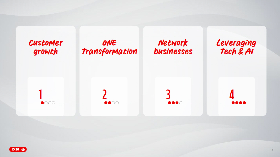 14 Note : TSB and Webster transactions pending completion and subject to customary conditions including regulatory and, for Webster also shareholder approvals . 1. € constant at constant perimeter (excluding Poland in 2025 and announced bolt - ons) . Revenue u p Increasing RoTE & Scale Customer focus Diversificatio n ONE Transformation Higher V alue Creation Network businesses Disciplined capital allocation driving best - in - class profitability Customer growth Leveraging Tech & AI Our unique business model and ONE Transformation , powered by our network businesses, will drive a new paradigm of growth and capital allocation Costs down every year 1 M&A execution