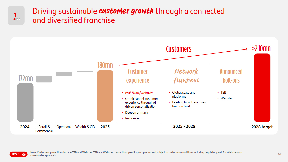 16 Customer experience Network flywheel • Global scale and platforms • Leading local franchises built on trust • ONE Transformation • Omnichannel customer experience through AI - driven personalization • Deepen primacy • Insurance 2024 172 mn 180m n >210 mn 2025 2028 target 2025 - 2028 Announced bolt - ons • TSB • Webster Retail & Commercial Openbank Wealth & CIB 1 Driving sustainable customer growth through a connected and diversified franchise Note : Customers projections include TSB and Webster . TSB and Webster transactions pending completion and subject to customary conditions including regulatory and, for Webster also shareholder approvals . Customer s