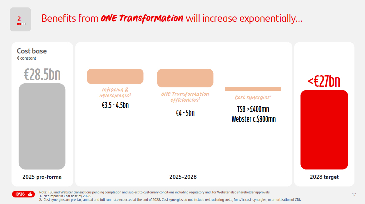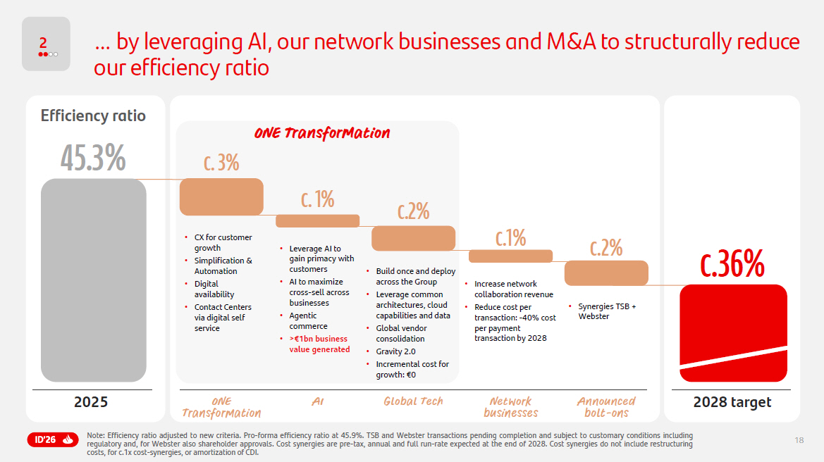 17 2 Benefits from ONE Transformation will increase exponentially… Note : TSB and Webster transactions pending completion and subject to customary conditions including regulatory and, for Webster also shareholder approvals . 1. Net impact in Cost base by 2028 . 2. Cost synergies are pre - tax, annual and full run - rate expected at the end of 2028 . Cost synergies do not include restructuring costs, for c . 1 x cost - synergies, or amortization of CDI . 2025 pro - forma 2028 target €28.5 bn <€27 bn Cost synergies 2 TSB >£400mn Webster c.$800mn 2025 - 2028 Inflation & investments 1 €3.5 - 4.5bn ONE Transformation efficiencies 1 €4 - 5bn Cost base € c onsta nt