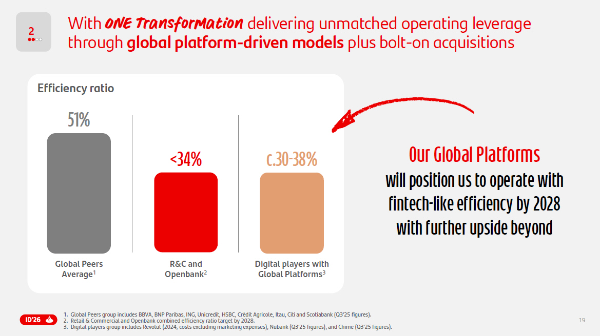 19 Global Peers Average 1 51% R&C and O penbank 2 c.30 - 38% Digital players with Global Platforms 3 <34% Efficiency ratio Our Global Platforms will position us to operate with fintech - like efficiency by 2028 with further upside beyond 2 With ONE Transformation delivering unmatched operating leverage through global platform - driven models plus bolt - on acquisitions 1. Global Peers group includes BBVA, BNP Paribas, ING, Unicredit, HSBC, Crédit Agricole, Itau , Citi and Scotiabank (Q 3 ’ 25 figures) . 2. Retail & Commercial and Openbank combined efficiency ratio target by 2028 . 3. Digital players group includes Revolut ( 2024 , costs excluding marketing expenses), Nubank (Q 3 ’ 25 figures), and Chime (Q 3 ’ 25 figures) .