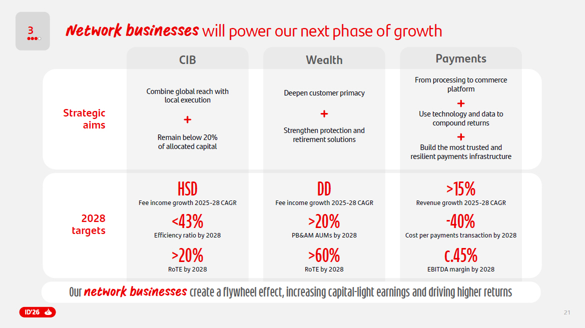 20 Growth Efficiencies Announced bolt - ons 2025 14.8 % 1 2028 target >20 % R etail & Commercial and Openbank combined RoTE waterfall Capital allocation Webster TSB >+1pp >+1pp >+1pp >+ 1pp 2 ONE Transformation: Our Retail & Commercial and Openbank RoTE improvement is mostly under our control Note : RoTE percentage points change including weighted average impact from the growth in tangible equity . TSB and Webster transactions pending completion and subject to customary conditions including regulatory and, for Webster also shareholder approvals . Cost synergies are pre - tax, annual and full run - rate expected at the end of 2028 . Cost synergies do not include restructuring costs, for c . 1 x cost - synergies, or amortization of CDI . 1. Excluding Motor Finance .