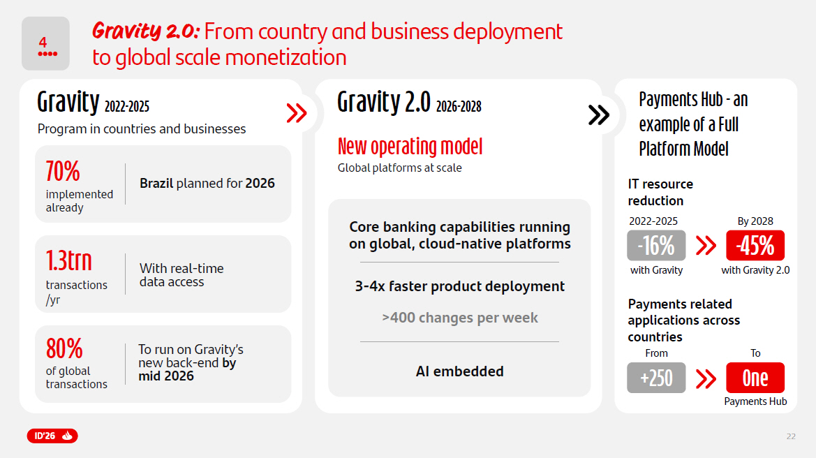 22 Brazil planned for 2026 70% implemented already Gravity 2022 - 2025 Program in countries and businesses 1.3trn transactions /yr With real - time data access 80% of global transactions To run on Gravity’s new back - end by mid 2026 Gravity 2.0 2026 - 2028 New operating model Global platforms at scale AI embedded Payments Hub - an example of a Full Platform Model IT resource reduction Payments related applications across countries - 45 % 2022 - 2025 By 2028 - 16 % with Gravity 2.0 with Gravity From +25 0 One To Payments Hub 4 Gravity 2.0: From country and business deployment to global scale monetization 3 - 4x faster product deployment >400 changes per week Core banking capabilities running on global, cloud - native platforms