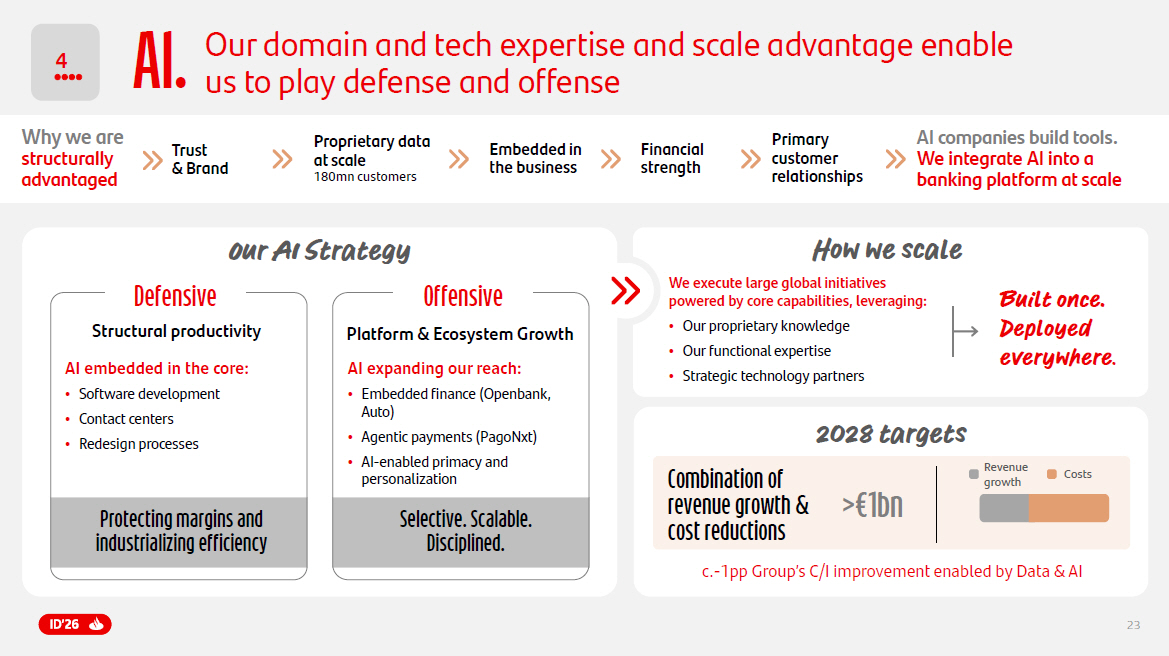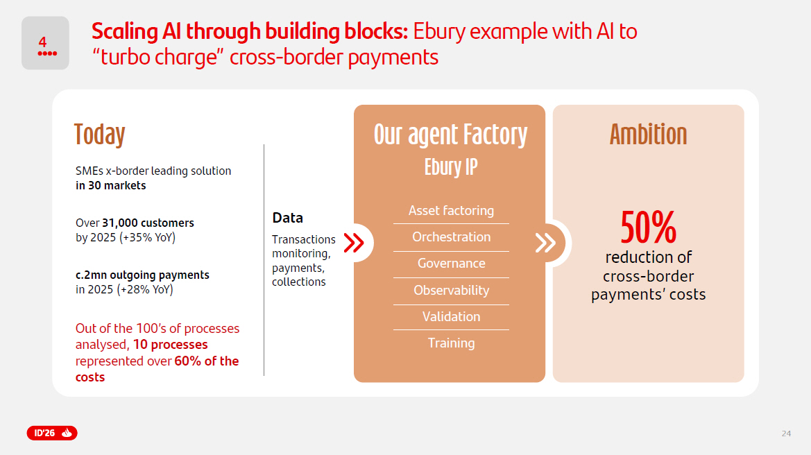23 How we scale A I. Why we are structurally advantaged Combination of revenue growth & cost reductions c. - 1pp Group’s C/I improvement enabled by Data & AI > €1bn Defensive Offensive Structural productivity AI embedded in the core: • Software development • Contact centers • Redesign processes Platform & Ecosystem Growth 2028 targets Our AI Strategy Protecting margins and industrializing efficiency AI expanding our reach: • Embedded finance (Openbank, Auto) • Agentic payments (PagoNxt) • AI - enabled primacy and personalization Selective. Scalable. Disciplined. AI companies build tools. We integrate AI into a banking platform at scale We execute large global initiatives powered by core capabilities, leveraging: • Our proprietary knowledge • Our functional expertise • Strategic technology partners Built once. Deployed everywhere . Proprietary data at scale 180mn customers Embedded in t he business Financial strength Primary customer relationships 4 Our domain and tech expertise and scale advantage enable us to play defense and offense Costs Revenue growth Trust & Brand