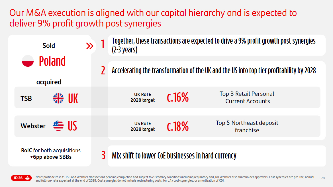 29 Polan d Sold RoIC for both acquisitions +6pp above SBBs Together, these transactions are expected to drive a 9% profit growth post synergies ( 2 - 3 years) 1 Mix shift to lower CoE businesses in hard currency 3 Accelerating the transformation of the UK and the US into top tier profitability by 2028 2 c.18 % Top 5 Northeast deposit franchise U S Webster US RoTE 2028 target U K TSB c.16 % UK RoTE 2028 target Top 3 Retail Personal Current Accounts acquired Note: profit delta in €. TSB and Webster transactions pending completion and subject to customary conditions including regula tor y and, for Webster also shareholder approvals. Cost synergies are pre - tax, annual and full run - rate expected at the end of 2028. Cost synergies do not include restructuring costs, for c.1x cost - synergies, or amortizati on of CDI. Our M&A execution is aligned with our capital hierarchy and is expected to deliver 9% profit growth post synergies