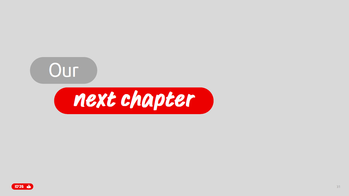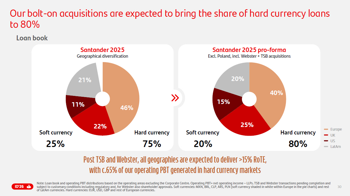 30 Loan book Post TSB and Webster, all geographies are expected to deliver >15% RoTE , with c.65% of our operating PBT generated in hard currency markets Excl. Poland , incl. Webster + TSB acquisitions 22% Soft currency Hard currency Santander 2025 pro - forma 7 5% 20% 2 5% 80 % 40% 25% 15% 20% 22% Europe UK US LatAm Geographical diversification Santander 2025 11% 22% 21% 46% Note: Loan book and operating PBT distributions based on the operating areas excluding the Corporate Centre. Operating PBT= n et operating income – LLPs. TSB and Webster transactions pending completion and subject to customary conditions including regulatory and, for Webster also shareholder approvals. Soft currencies: MXN, BRL, CLP, ARS , P LN (soft currency shaded in white within Europe in the pie charts) and rest of LatAm currencies. Hard currencies: EUR, USD, GBP and rest of European currencies. Our bolt - on acquisitions are expected to bring the share of hard currency loans to 80% Soft currency Hard currency