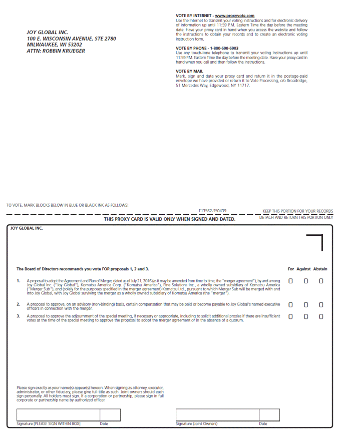 VOTE BY INTERNET - www.proxyvote.com Use the Internet to transmit your voting instructions and for electronic delivery of information up until 11:59 P.M. Eastern Time the day before the meeting date. Have your proxy card in hand when you access the website and follow the instructions to obtain your records and to create an electronic voting instruction form. JOY GLOBAL INC. 100 E. WISCONSIN AVENUE, STE 2780 MILWAUKEE, WI 53202 ATTN: ROBBIN KRUEGER VOTE BY PHONE - 1-800-690-6903 Use any touch-tone telephone to transmit your voting instructions up until 11:59 P.M. Eastern Time the day before the meeting date. Have your proxy card in hand when you call and then follow the instructions. VOTE BY MAIL Mark, sign and date your proxy card and return it in the postage-paid envelope we have provided or return it to Vote Processing, c/o Broadridge, 51 Mercedes Way, Edgewood, NY 11717. TO VOTE, MARK BLOCKS BELOW IN BLUE OR BLACK INK AS FOLLOWS: E13562-S50439 KEEP THIS PORTION FOR YOUR RECORDS DETACH AND RETURN THIS PORTION ONLY THIS PROXY CARD IS VALID ONLY WHEN SIGNED AND DATED. JOY GLOBAL INC. The Board of Directors recommends you vote FOR proposals 1, 2 and 3. For Against Abstain ! ! ! 1. A proposal to adopt the Agreement and Plan of Merger, dated as of July 21, 2016 (as it may be amended from time to time, the "merger agreement"), by and among Joy Global Inc. ("Joy Global"), Komatsu America Corp. ("Komatsu America"), Pine Solutions Inc., a wholly owned subsidiary of Komatsu America ("Merger Sub"), and (solely for the purposes specified in the merger agreement) Komatsu Ltd., pursuant to which Merger Sub will be merged with and into Joy Global, with Joy Global surviving the merger as a wholly owned subsidiary of Komatsu America (the "merger"). ! ! ! ! ! ! 2. A proposal to approve, on an advisory (non-binding) basis, certain compensation that may be paid or become payable to Joy Global's named executive officers in connection with the merger. A proposal to approve the adjournment of the special meeting, if necessary or appropriate, including to solicit additional proxies if there are insufficient votes at the time of the special meeting to approve the proposal to adopt the merger agreement or in the absence of a quorum. 3. Please sign exactly as your name(s) appear(s) hereon. When signing as attorney, executor, administrator, or other fiduciary, please give full title as such. Joint owners should each sign personally. All holders must sign. If a corporation or partnership, please sign in full corporate or partnership name by authorized officer. Signature [PLEASE SIGN WITHIN BOX] Date Signature (Joint Owners) Date