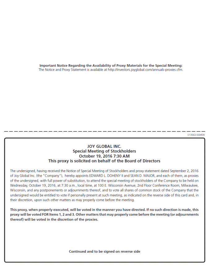 Important Notice Regarding the Availability of Proxy Materials for the Special Meeting: The Notice and Proxy Statement is available at http://investors.joyglobal.com/annuals-proxies.cfm. E13563-S50439 JOY GLOBAL INC. Special Meeting of Stockholders October 19, 2016 7:30 AM This proxy is solicited on behalf of the Board of Directors The undersigned, having received the Notice of Special Meeting of Stockholders and proxy statement dated September 2, 2016 of Joy Global Inc. (the "Company"), hereby appoints EDWARD L. DOHENY II and SEAN D. MAJOR, and each of them, as proxies of the undersigned, with full power of substitution, to attend the special meeting of stockholders of the Company to be held on Wednesday, October 19, 2016, at 7:30 a.m., local time, at 100 E. Wisconsin Avenue, 2nd Floor Conference Room, Milwaukee, Wisconsin, and any postponements or adjournments thereof, and to vote all shares of common stock of the Company that the undersigned would be entitled to vote if personally present at such meeting, as indicated on the reverse side of this card and, in their discretion, upon such other matters as may properly come before the meeting. This proxy, when properly executed, will be voted in the manner you have directed. If no such direction is made, this proxy will be voted FOR Items 1, 2 and 3. Other matters that may properly come before the meeting (or adjournments thereof) will be voted in the discretion of the proxies. Continued and to be signed on reverse side