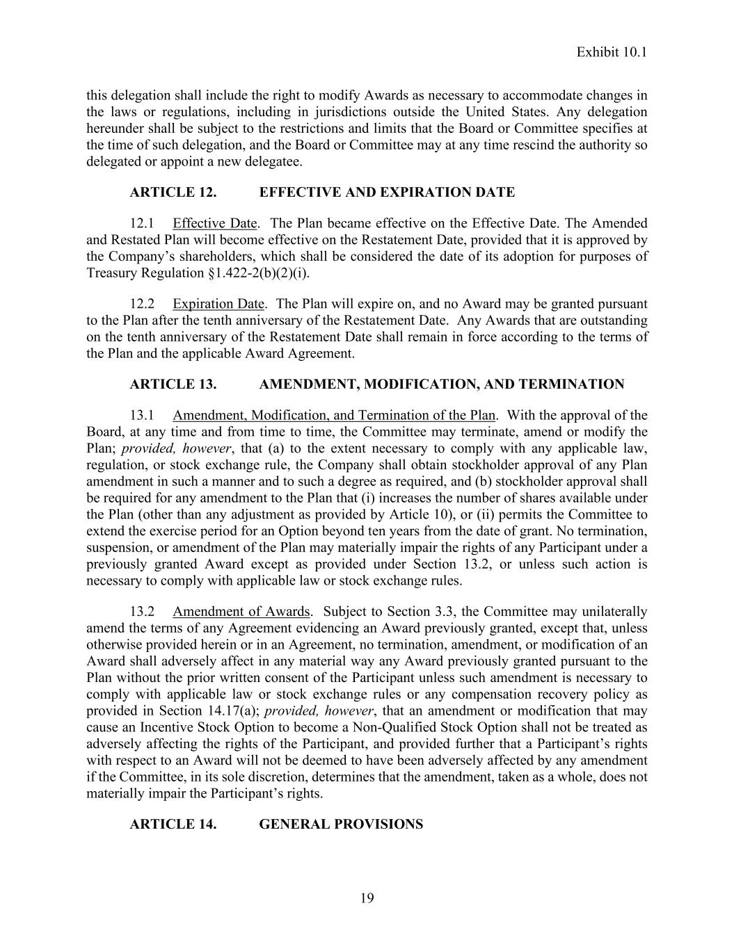Exhibit 10.1 19 this delegation shall include the right to modify Awards as necessary to accommodate changes in the laws or regulations, including in jurisdictions outside the United States. Any delegation hereunder shall be subject to the restrictions and limits that the Board or Committee specifies at the time of such delegation, and the Board or Committee may at any time rescind the authority so delegated or appoint a new delegatee. ARTICLE 12. EFFECTIVE AND EXPIRATION DATE 12.1 Effective Date. The Plan became effective on the Effective Date. The Amended and Restated Plan will become effective on the Restatement Date, provided that it is approved by the Company’s shareholders, which shall be considered the date of its adoption for purposes of Treasury Regulation §1.422-2(b)(2)(i). 12.2 Expiration Date. The Plan will expire on, and no Award may be granted pursuant to the Plan after the tenth anniversary of the Restatement Date. Any Awards that are outstanding on the tenth anniversary of the Restatement Date shall remain in force according to the terms of the Plan and the applicable Award Agreement. ARTICLE 13. AMENDMENT, MODIFICATION, AND TERMINATION 13.1 Amendment, Modification, and Termination of the Plan. With the approval of the Board, at any time and from time to time, the Committee may terminate, amend or modify the Plan; provided, however, that (a) to the extent necessary to comply with any applicable law, regulation, or stock exchange rule, the Company shall obtain stockholder approval of any Plan amendment in such a manner and to such a degree as required, and (b) stockholder approval shall be required for any amendment to the Plan that (i) increases the number of shares available under the Plan (other than any adjustment as provided by Article 10), or (ii) permits the Committee to extend the exercise period for an Option beyond ten years from the date of grant. No termination, suspension, or amendment of the Plan may materially impair the rights of any Participant under a previously granted Award except as provided under Section 13.2, or unless such action is necessary to comply with applicable law or stock exchange rules. 13.2 Amendment of Awards. Subject to Section 3.3, the Committee may unilaterally amend the terms of any Agreement evidencing an Award previously granted, except that, unless otherwise provided herein or in an Agreement, no termination, amendment, or modification of an Award shall adversely affect in any material way any Award previously granted pursuant to the Plan without the prior written consent of the Participant unless such amendment is necessary to comply with applicable law or stock exchange rules or any compensation recovery policy as provided in Section 14.17(a); provided, however, that an amendment or modification that may cause an Incentive Stock Option to become a Non-Qualified Stock Option shall not be treated as adversely affecting the rights of the Participant, and provided further that a Participant’s rights with respect to an Award will not be deemed to have been adversely affected by any amendment if the Committee, in its sole discretion, determines that the amendment, taken as a whole, does not materially impair the Participant’s rights. ARTICLE 14. GENERAL PROVISIONS