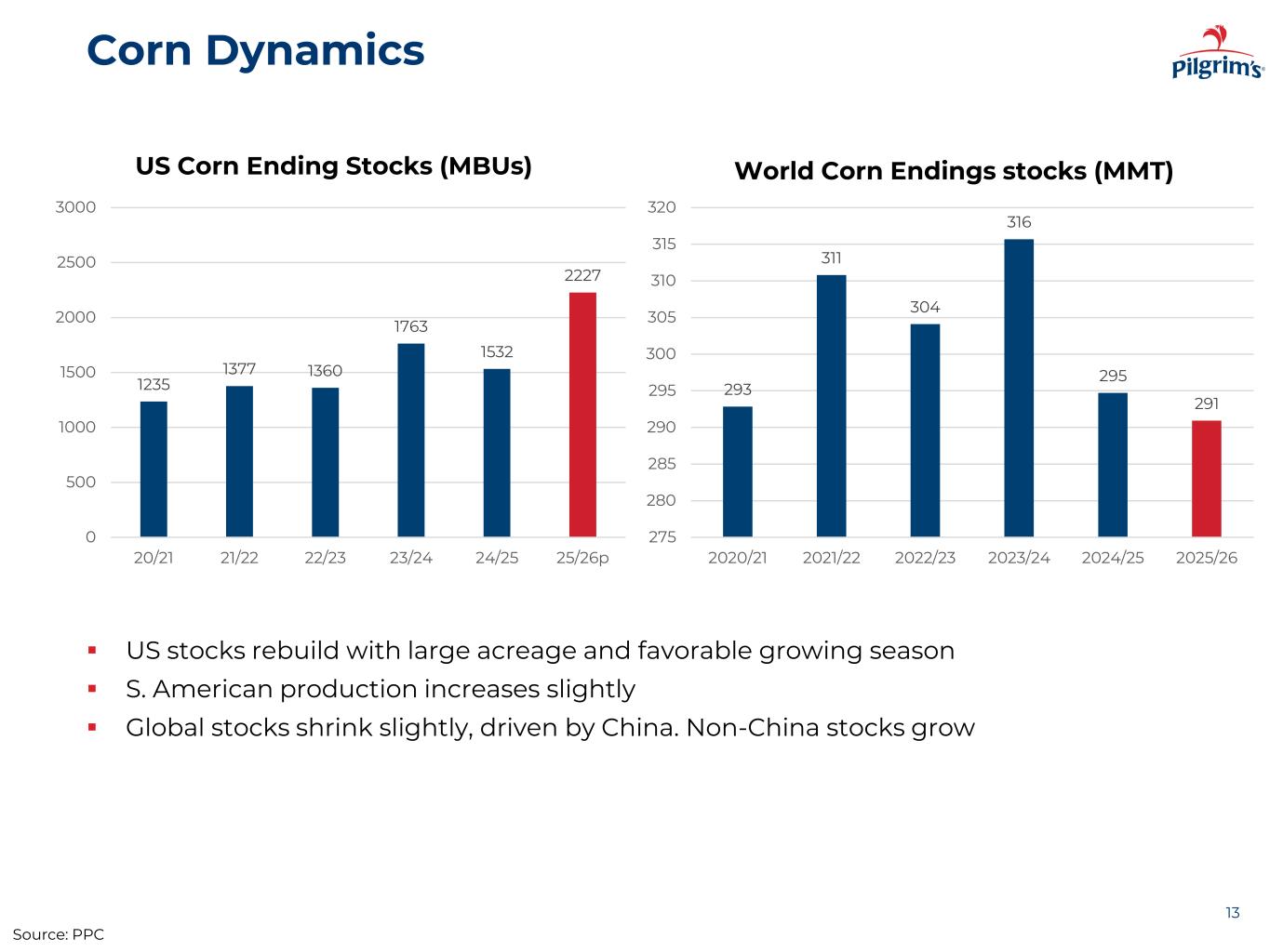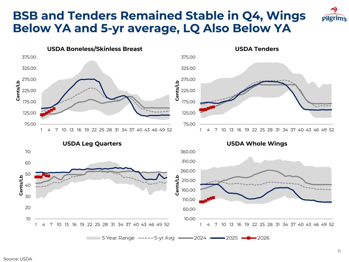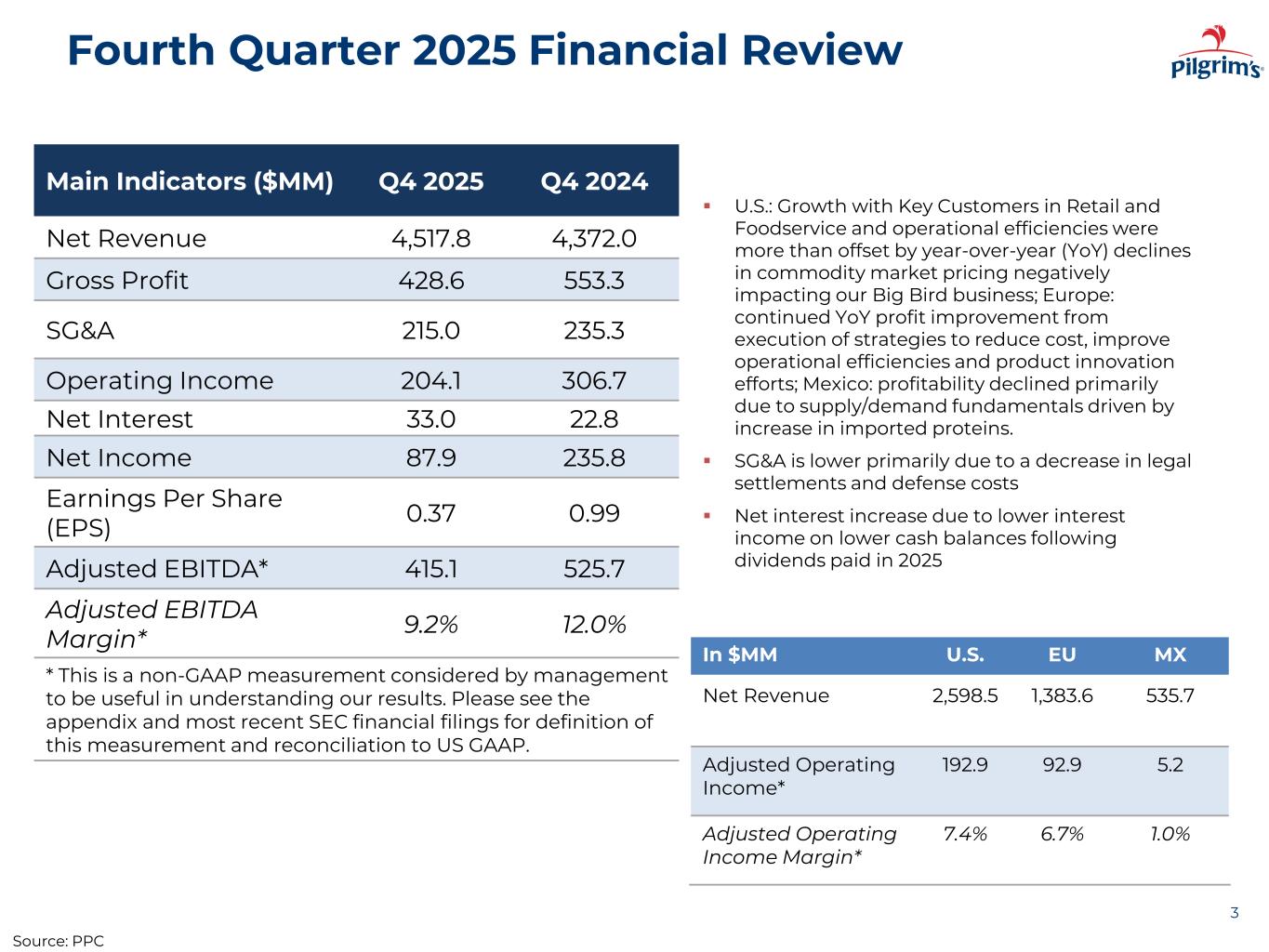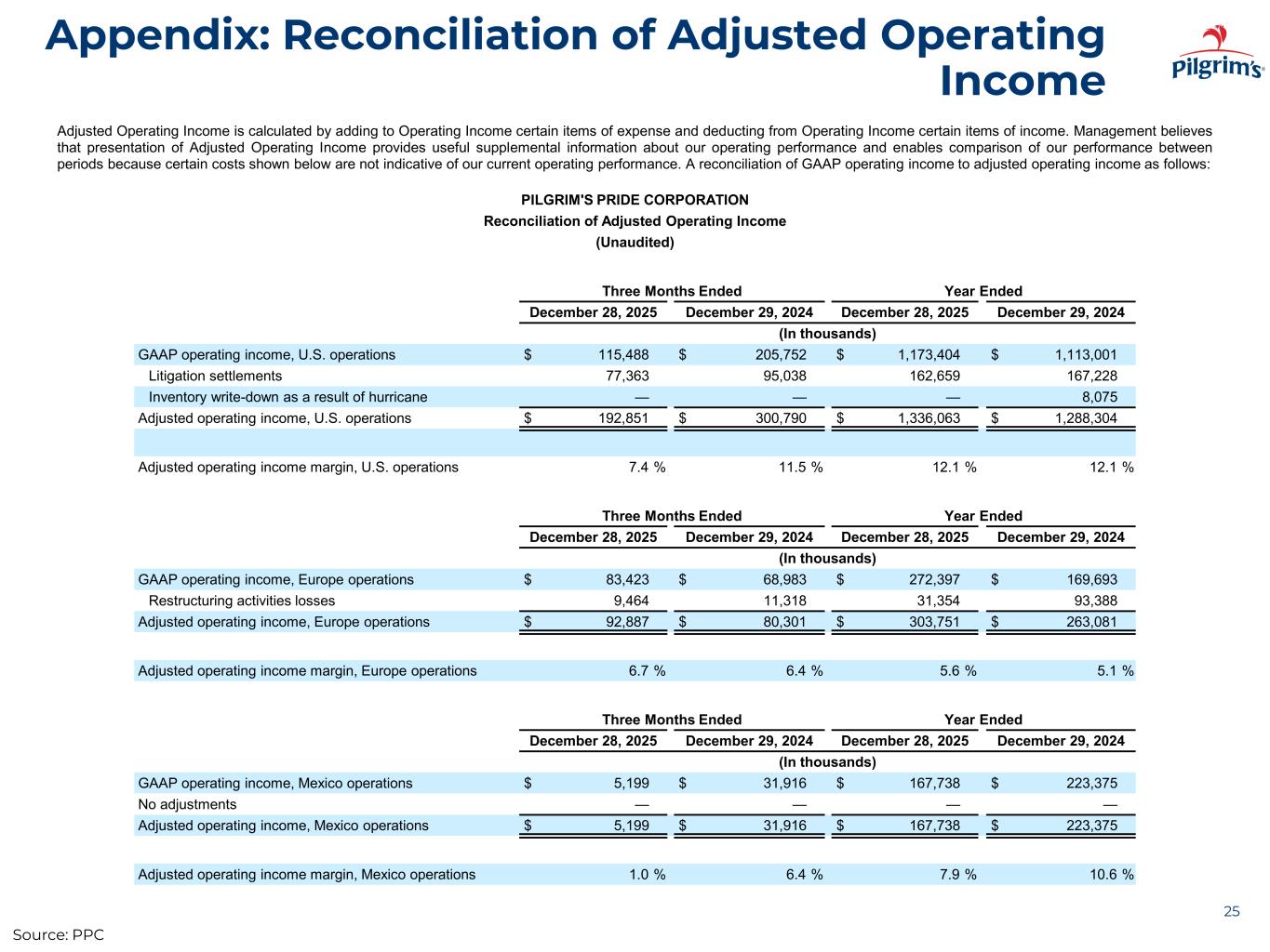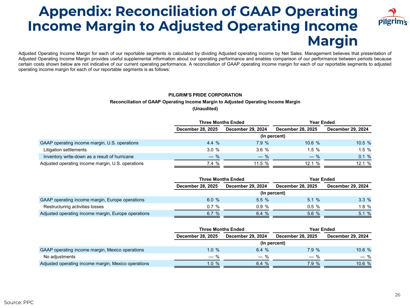 Appendix: Reconciliation of Adjusted Operating Income 25 Adjusted Operating Income is calculated by adding to Operating Income certain items of expense and deducting from Operating Income certain items of income. Management believes that presentation of Adjusted Operating Income provides useful supplemental information about our operating performance and enables comparison of our performance between periods because certain costs shown below are not indicative of our current operating performance. A reconciliation of GAAP operating income to adjusted operating income as follows: PILGRIM'S PRIDE CORPORATION Reconciliation of Adjusted Operating Income (Unaudited) Three Months Ended Year Ended December 28, 2025 December 29, 2024 December 28, 2025 December 29, 2024 (In thousands) GAAP operating income, U.S. operations $ 115,488 $ 205,752 $ 1,173,404 $ 1,113,001 Litigation settlements 77,363 95,038 162,659 167,228 Inventory write-down as a result of hurricane — — — 8,075 Adjusted operating income, U.S. operations $ 192,851 $ 300,790 $ 1,336,063 $ 1,288,304 Adjusted operating income margin, U.S. operations 7.4 % 11.5 % 12.1 % 12.1 % Three Months Ended Year Ended December 28, 2025 December 29, 2024 December 28, 2025 December 29, 2024 (In thousands) GAAP operating income, Europe operations $ 83,423 $ 68,983 $ 272,397 $ 169,693 Restructuring activities losses 9,464 11,318 31,354 93,388 Adjusted operating income, Europe operations $ 92,887 $ 80,301 $ 303,751 $ 263,081 Adjusted operating income margin, Europe operations 6.7 % 6.4 % 5.6 % 5.1 % Three Months Ended Year Ended December 28, 2025 December 29, 2024 December 28, 2025 December 29, 2024 (In thousands) GAAP operating income, Mexico operations $ 5,199 $ 31,916 $ 167,738 $ 223,375 No adjustments — — — — Adjusted operating income, Mexico operations $ 5,199 $ 31,916 $ 167,738 $ 223,375 Adjusted operating income margin, Mexico operations 1.0 % 6.4 % 7.9 % 10.6 % Source: PPC