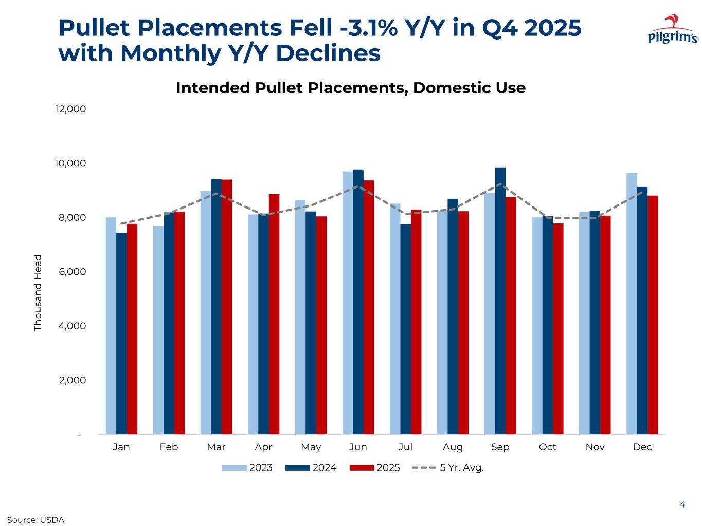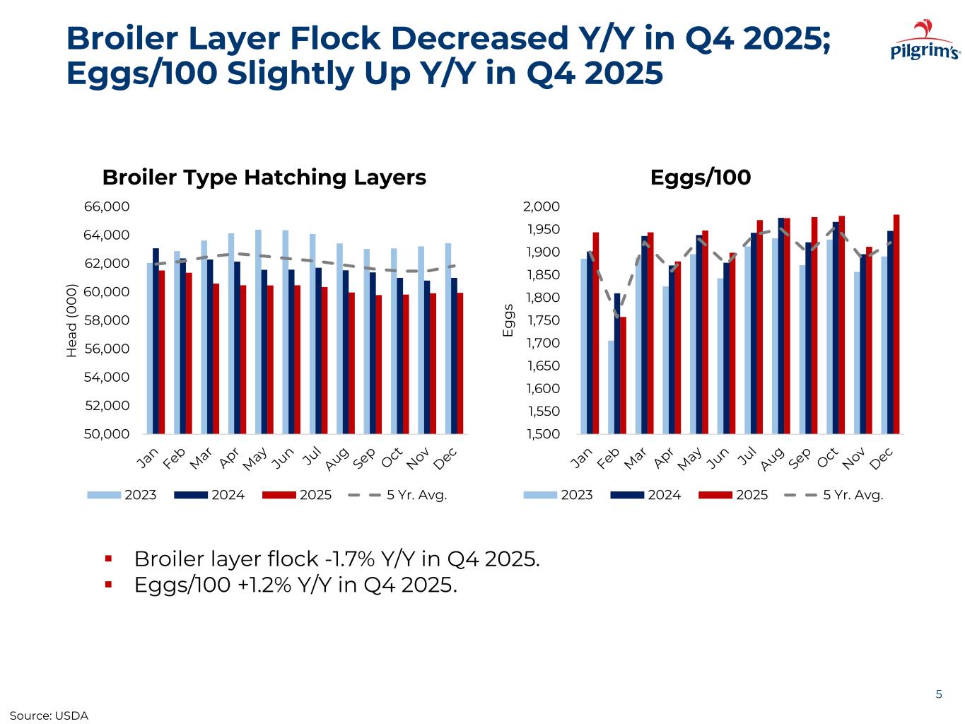 Pullet Placements Fell -3.1% Y/Y in Q4 2025 with Monthly Y/Y Declines 4 - 2,000 4,000 6,000 8,000 10,000 12,000 Jan Feb Mar Apr May Jun Jul Aug Sep Oct Nov Dec Th o u sa n d H ea d Intended Pullet Placements, Domestic Use 2023 2024 2025 5 Yr. Avg. Source: USDA