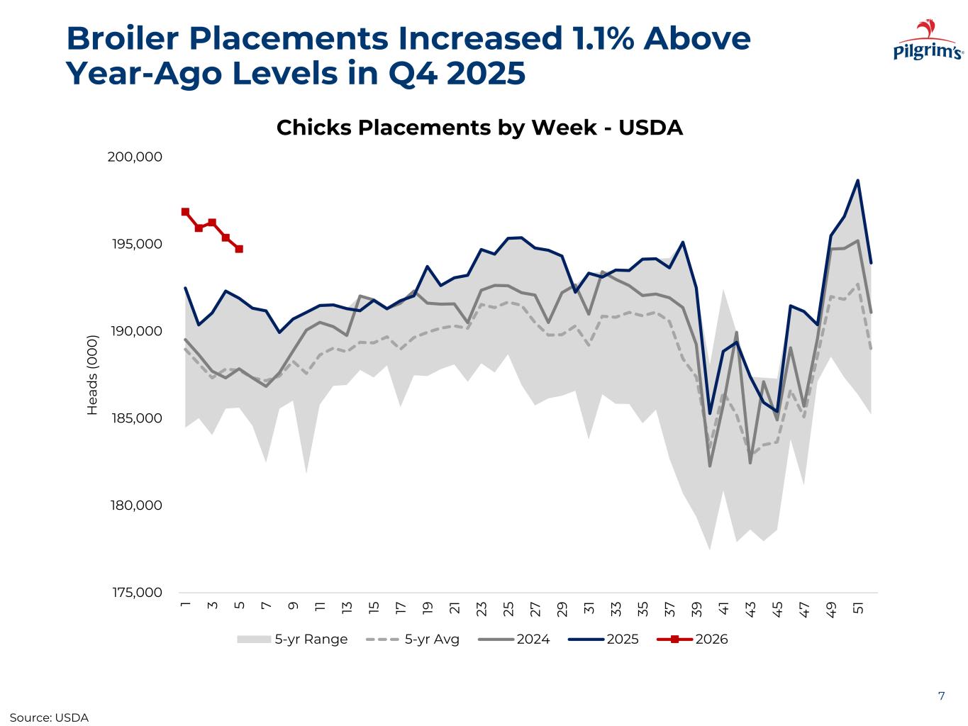 Egg Sets Increased 0.9% Y/Y in Q4 2025; Hatchability +0.1% Compared to Q4 2024 Levels 6 215,000 220,000 225,000 230,000 235,000 240,000 245,000 250,000 255,000 1 4 7 1 0 1 3 1 6 1 9 2 2 2 5 2 8 3 1 3 4 3 7 4 0 4 3 4 6 4 9 5 2 Eg gs ( 0 0 0 ) Chicken Eggs Set by Week - USDA 5-yr Range 5-yr Avg 2023 2024 2025 230,000 235,000 240,000 245,000 250,000 255,000 1 4 7 10 13 16 19 22 25 28 31 34 37 4 0 4 3 4 6 4 9 52 E g g s (0 0 0 ) Chicken Egg y ek - USDA 5-yr Range 5-yr Avg 2024 2025 2026 78% 79% 79% 80% 80% 81% 81% 82% 1 4 7 10 13 16 19 22 25 28 31 34 37 4 0 4 3 4 6 4 9 52 H at ch ab ili ty ( % ) Hatchability by Week - USDA 5-yr Range 5-yr Avg 2024 2025 2026 Note: Estimating hatchability for week 41-45 and week 51 as there is no data availableSource: USDA
