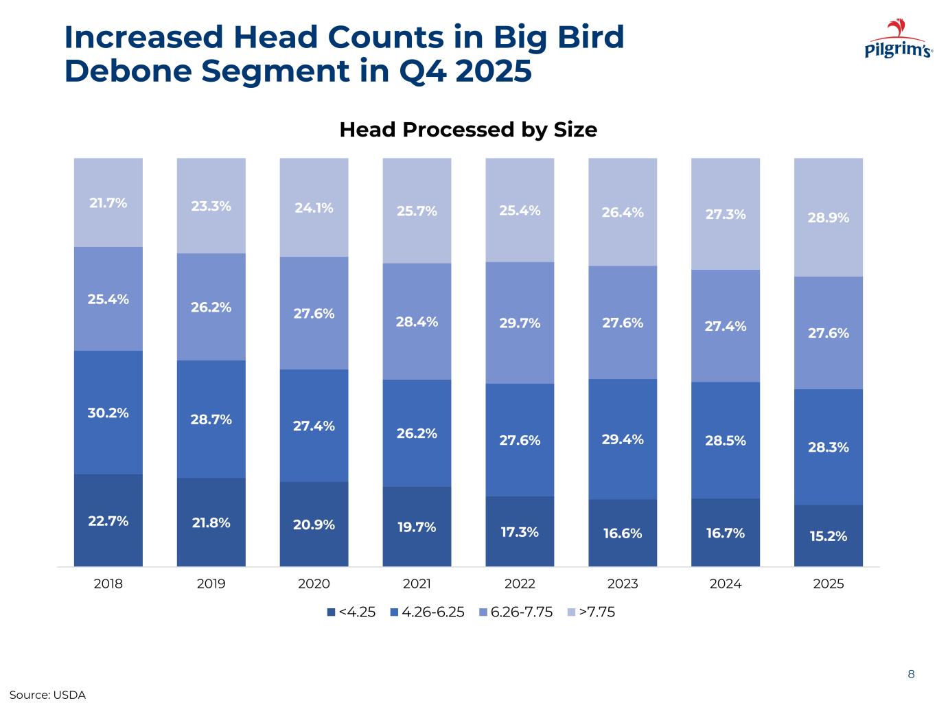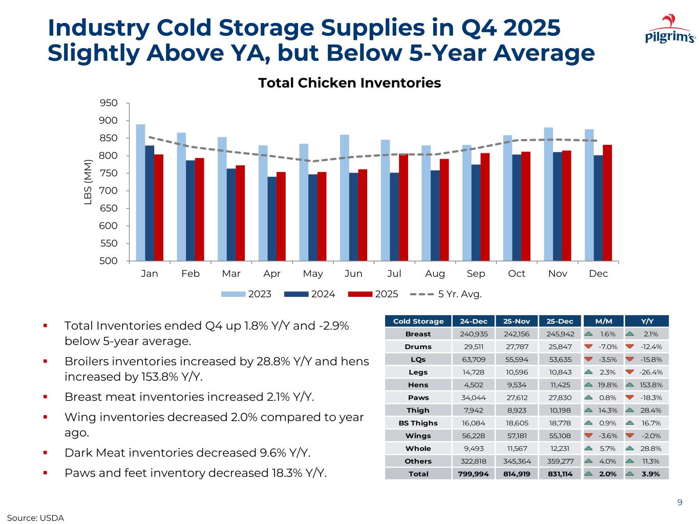 Increased Head Counts in Big Bird Debone Segment in Q4 2025 8 22.7% 21.8% 20.9% 19.7% 17.3% 16.6% 16.7% 15.2% 30.2% 28.7% 27.4% 26.2% 27.6% 29.4% 28.5% 28.3% 25.4% 26.2% 27.6% 28.4% 29.7% 27.6% 27.4% 27.6% 21.7% 23.3% 24.1% 25.7% 25.4% 26.4% 27.3% 28.9% 2018 2019 2020 2021 2022 2023 2024 2025 Head Processed by Size <4.25 4.26-6.25 6.26-7.75 >7.75 Source: USDA