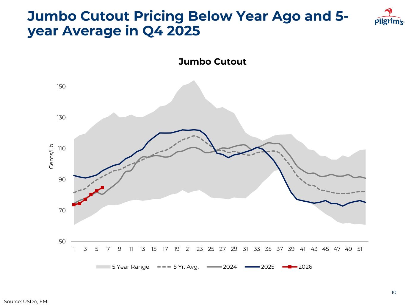 Jumbo Cutout Pricing Below Year Ago and 5- year Average in Q4 2025 10 50 70 90 110 130 150 1 3 5 7 9 11 13 15 17 19 21 23 25 27 29 31 33 35 37 39 41 43 45 47 49 51 C en ts /L b Jumbo Cutout 5 Year Range 5 Yr. Avg. 2024 2025 2026 Source: USDA, EMI