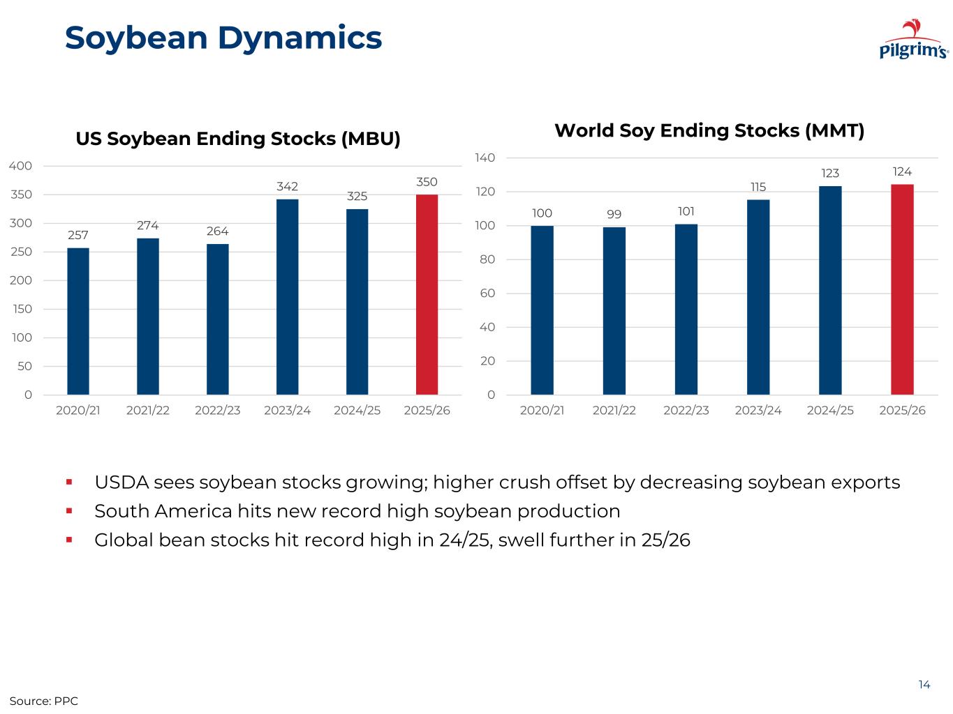 Corn Dynamics 13 Source: PPC ▪ US stocks rebuild with large acreage and favorable growing season ▪ S. American production increases slightly ▪ Global stocks shrink slightly, driven by China. Non-China stocks grow 1235 1377 1360 1763 1532 2227 0 500 1000 1500 2000 2500 3000 20/21 21/22 22/23 23/24 24/25 25/26p US Corn Ending Stocks (MBUs) 293 311 304 316 295 291 275 280 285 290 295 300 305 310 315 320 2020/21 2021/22 2022/23 2023/24 2024/25 2025/26 World Corn Endings stocks (MMT)