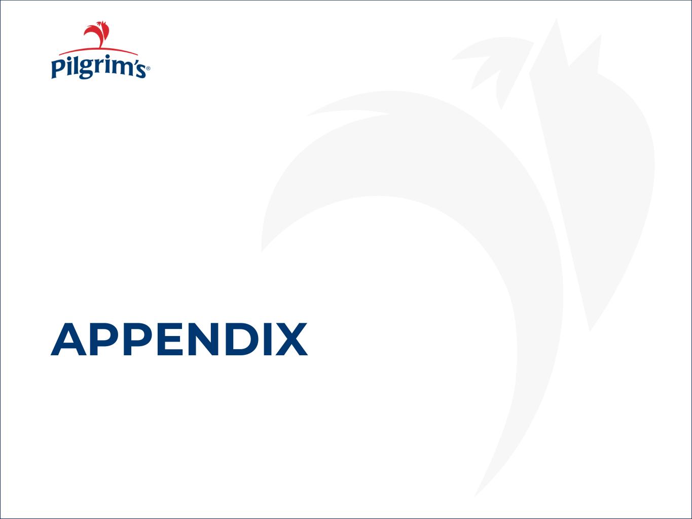 Appendix: Reconciliation of GAAP Operating Income Margin to Adjusted Operating Income Margin 26 Adjusted Operating Income Margin for each of our reportable segments is calculated by dividing Adjusted operating income by Net Sales. Management believes that presentation of Adjusted Operating Income Margin provides useful supplemental information about our operating performance and enables comparison of our performance between periods because certain costs shown below are not indicative of our current operating performance. A reconciliation of GAAP operating income margin for each of our reportable segments to adjusted operating income margin for each of our reportable segments is as follows: PILGRIM'S PRIDE CORPORATION Reconciliation of GAAP Operating Income Margin to Adjusted Operating Income Margin (Unaudited) Three Months Ended Year Ended December 28, 2025 December 29, 2024 December 28, 2025 December 29, 2024 (In percent) GAAP operating income margin, U.S. operations 4.4 % 7.9 % 10.6 % 10.5 % Litigation settlements 3.0 % 3.6 % 1.5 % 1.5 % Inventory write-down as a result of hurricane — % — % — % 0.1 % Adjusted operating income margin, U.S. operations 7.4 % 11.5 % 12.1 % 12.1 % Three Months Ended Year Ended December 28, 2025 December 29, 2024 December 28, 2025 December 29, 2024 (In percent) GAAP operating income margin, Europe operations 6.0 % 5.5 % 5.1 % 3.3 % Restructuring activities losses 0.7 % 0.9 % 0.5 % 1.8 % Adjusted operating income margin, Europe operations 6.7 % 6.4 % 5.6 % 5.1 % Three Months Ended Year Ended December 28, 2025 December 29, 2024 December 28, 2025 December 29, 2024 (In percent) GAAP operating income margin, Mexico operations 1.0 % 6.4 % 7.9 % 10.6 % No adjustments — % — % — % — % Adjusted operating income margin, Mexico operations 1.0 % 6.4 % 7.9 % 10.6 % Source: PPC