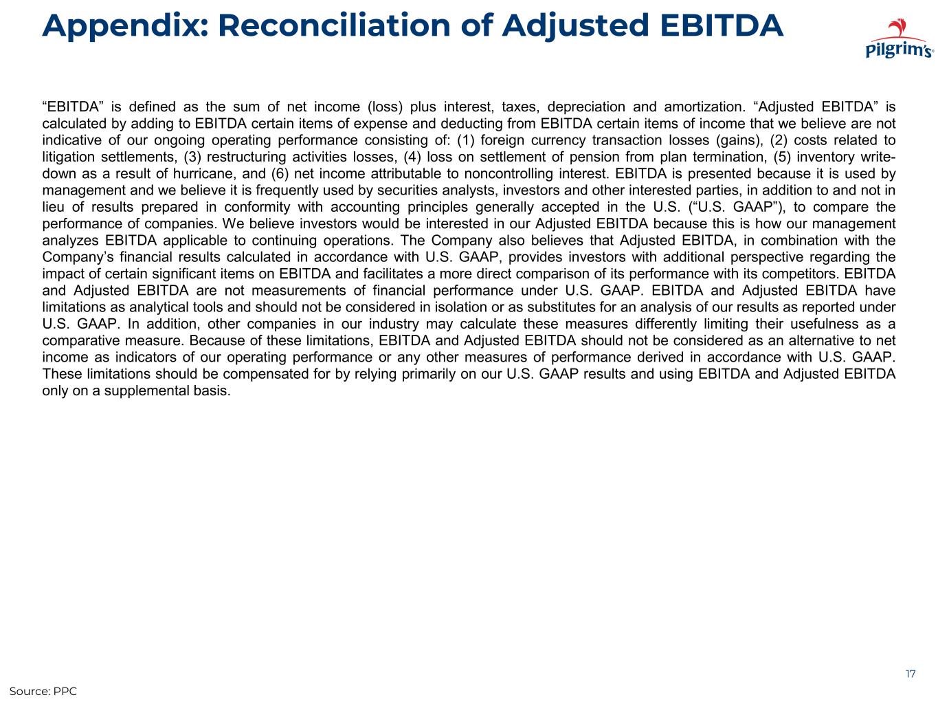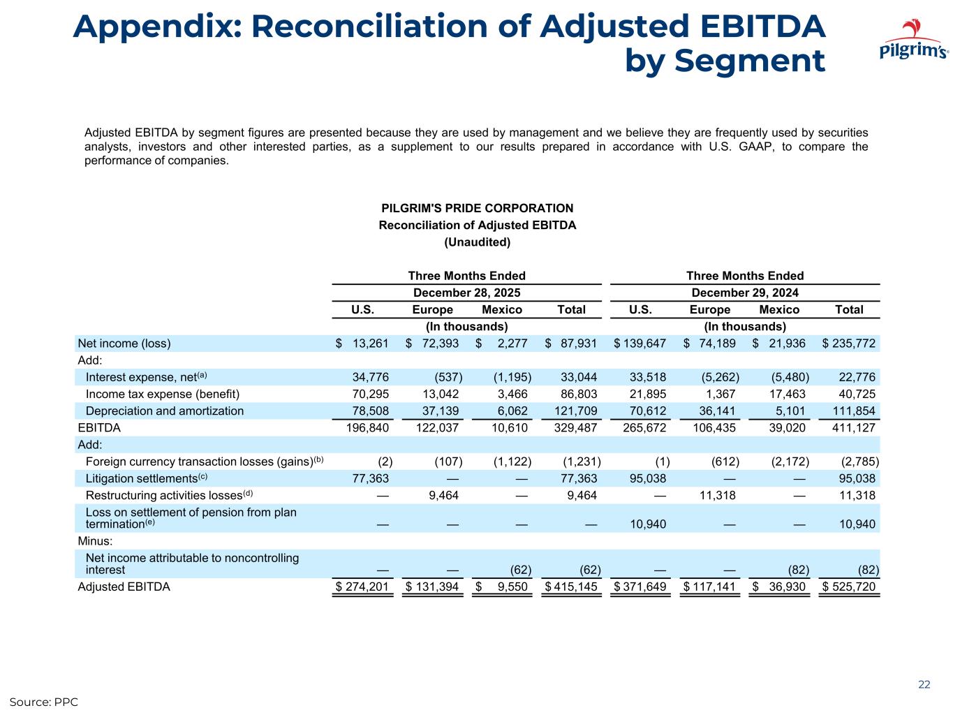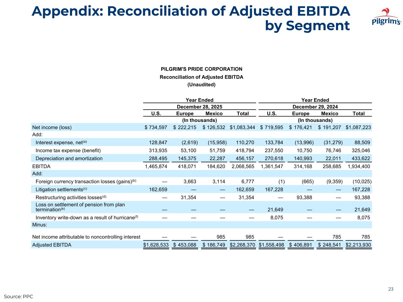 Appendix: Reconciliation of Adjusted EBITDA by Segment 22 PILGRIM'S PRIDE CORPORATION Reconciliation of Adjusted EBITDA (Unaudited) Three Months Ended Three Months Ended December 28, 2025 December 29, 2024 U.S. Europe Mexico Total U.S. Europe Mexico Total (In thousands) (In thousands) Net income (loss) $ 13,261 $ 72,393 $ 2,277 $ 87,931 $ 139,647 $ 74,189 $ 21,936 $ 235,772 Add: Interest expense, net(a) 34,776 (537) (1,195) 33,044 33,518 (5,262) (5,480) 22,776 Income tax expense (benefit) 70,295 13,042 3,466 86,803 21,895 1,367 17,463 40,725 Depreciation and amortization 78,508 37,139 6,062 121,709 70,612 36,141 5,101 111,854 EBITDA 196,840 122,037 10,610 329,487 265,672 106,435 39,020 411,127 Add: Foreign currency transaction losses (gains)(b) (2) (107) (1,122) (1,231) (1) (612) (2,172) (2,785) Litigation settlements(c) 77,363 — — 77,363 95,038 — — 95,038 Restructuring activities losses(d) — 9,464 — 9,464 — 11,318 — 11,318 Loss on settlement of pension from plan termination(e) — — — — 10,940 — — 10,940 Minus: Net income attributable to noncontrolling interest — — (62) (62) — — (82) (82) Adjusted EBITDA $ 274,201 $ 131,394 $ 9,550 $ 415,145 $ 371,649 $ 117,141 $ 36,930 $ 525,720 Adjusted EBITDA by segment figures are presented because they are used by management and we believe they are frequently used by securities analysts, investors and other interested parties, as a supplement to our results prepared in accordance with U.S. GAAP, to compare the performance of companies. Source: PPC