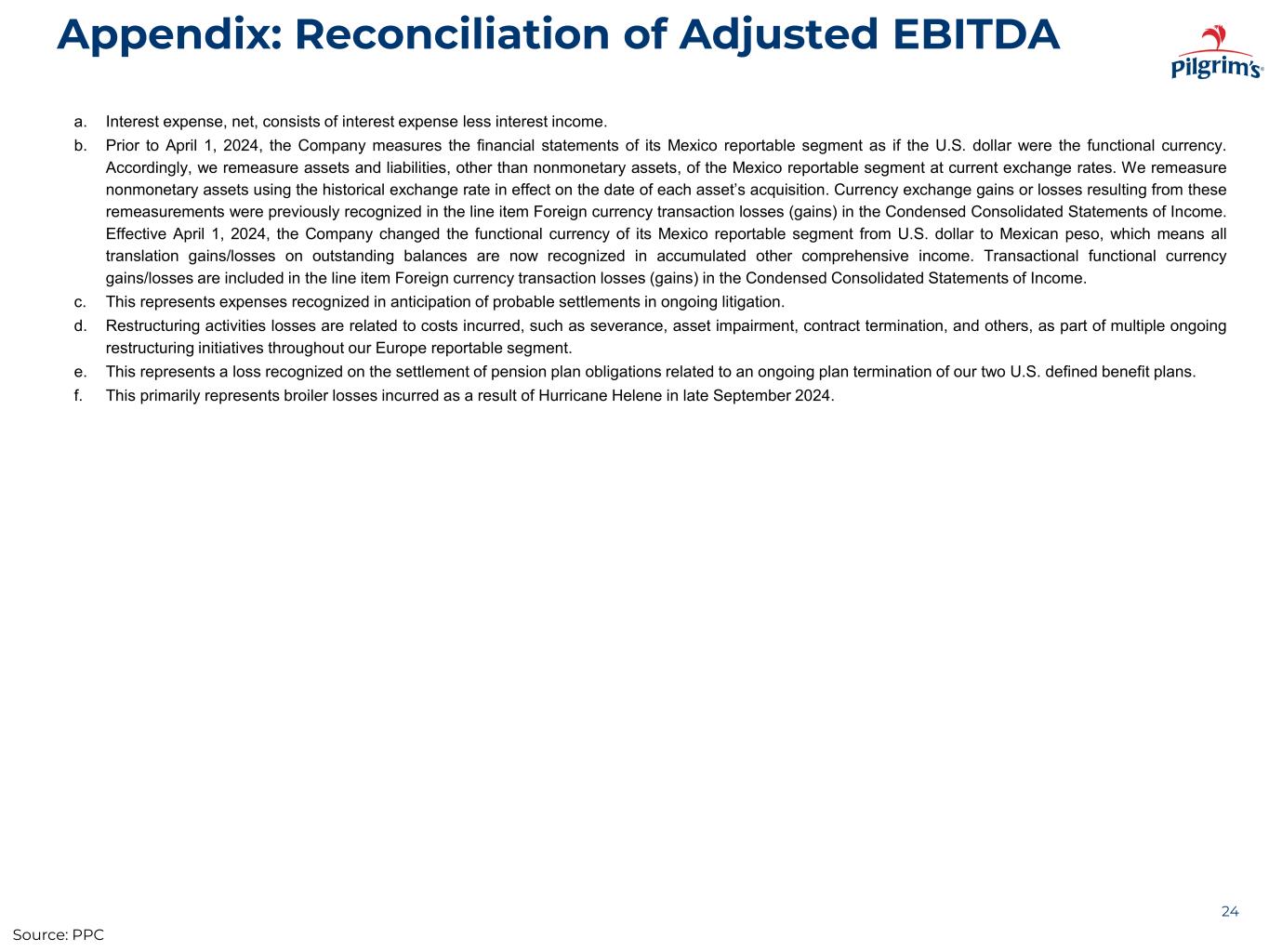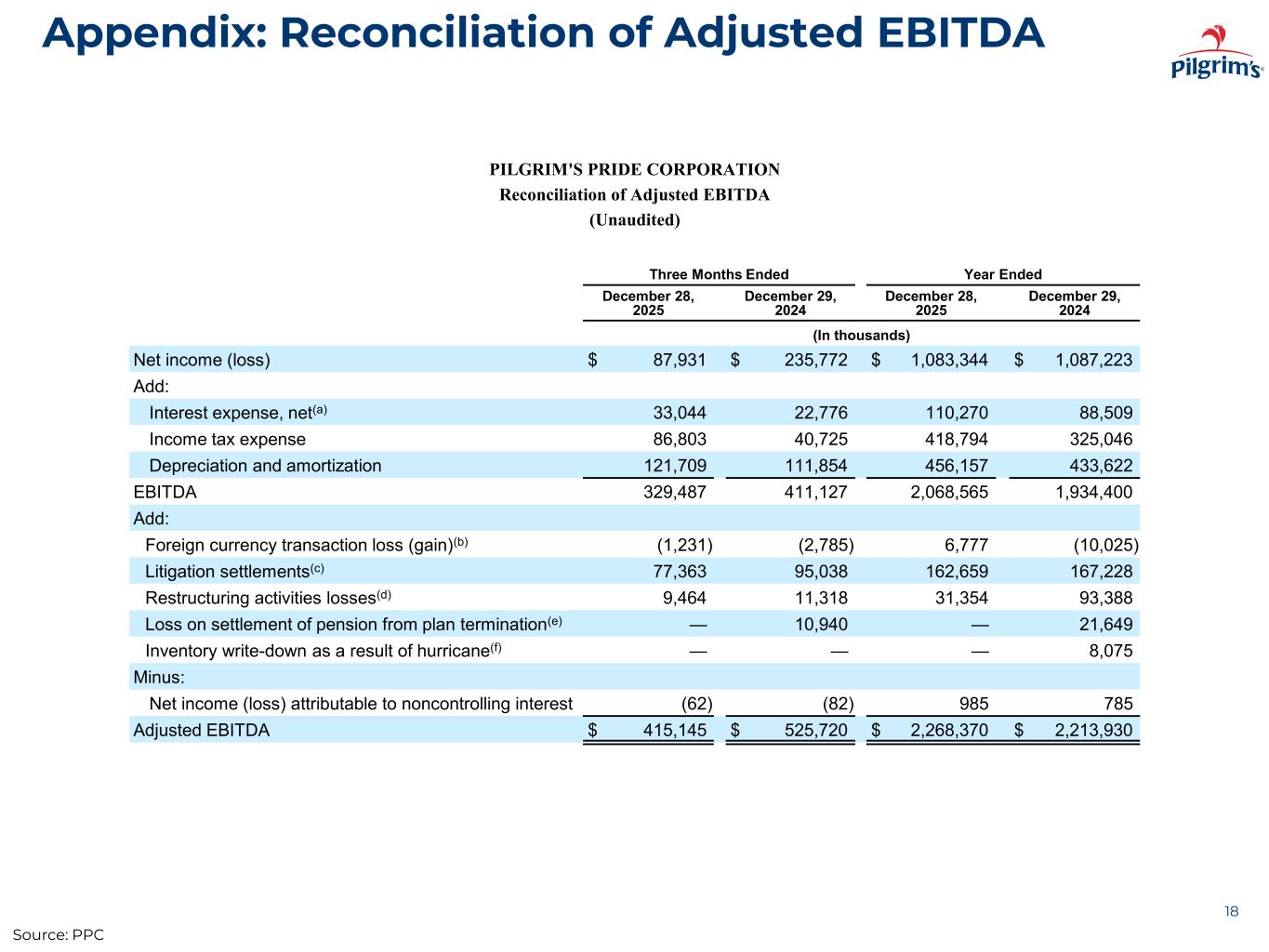 Appendix: Reconciliation of Adjusted EBITDA by Segment 23 PILGRIM'S PRIDE CORPORATION Reconciliation of Adjusted EBITDA (Unaudited) Year Ended Year Ended December 28, 2025 December 29, 2024 U.S. Europe Mexico Total U.S. Europe Mexico Total (In thousands) (In thousands) Net income (loss) $ 734,597 $ 222,215 $ 126,532 $1,083,344 $ 719,595 $ 176,421 $ 191,207 $1,087,223 Add: Interest expense, net(a) 128,847 (2,619) (15,958) 110,270 133,784 (13,996) (31,279) 88,509 Income tax expense (benefit) 313,935 53,100 51,759 418,794 237,550 10,750 76,746 325,046 Depreciation and amortization 288,495 145,375 22,287 456,157 270,618 140,993 22,011 433,622 EBITDA 1,465,874 418,071 184,620 2,068,565 1,361,547 314,168 258,685 1,934,400 Add: Foreign currency transaction losses (gains)(b) — 3,663 3,114 6,777 (1) (665) (9,359) (10,025) Litigation settlements(c) 162,659 — — 162,659 167,228 — — 167,228 Restructuring activities losses(d) — 31,354 — 31,354 — 93,388 — 93,388 Loss on settlement of pension from plan termination(e) — — — — 21,649 — — 21,649 Inventory write-down as a result of hurricane(f) — — — — 8,075 — — 8,075 Minus: Net income attributable to noncontrolling interest — — 985 985 — — 785 785 Adjusted EBITDA $1,628,533 $ 453,088 $ 186,749 $2,268,370 $1,558,498 $ 406,891 $ 248,541 $2,213,930 Source: PPC
