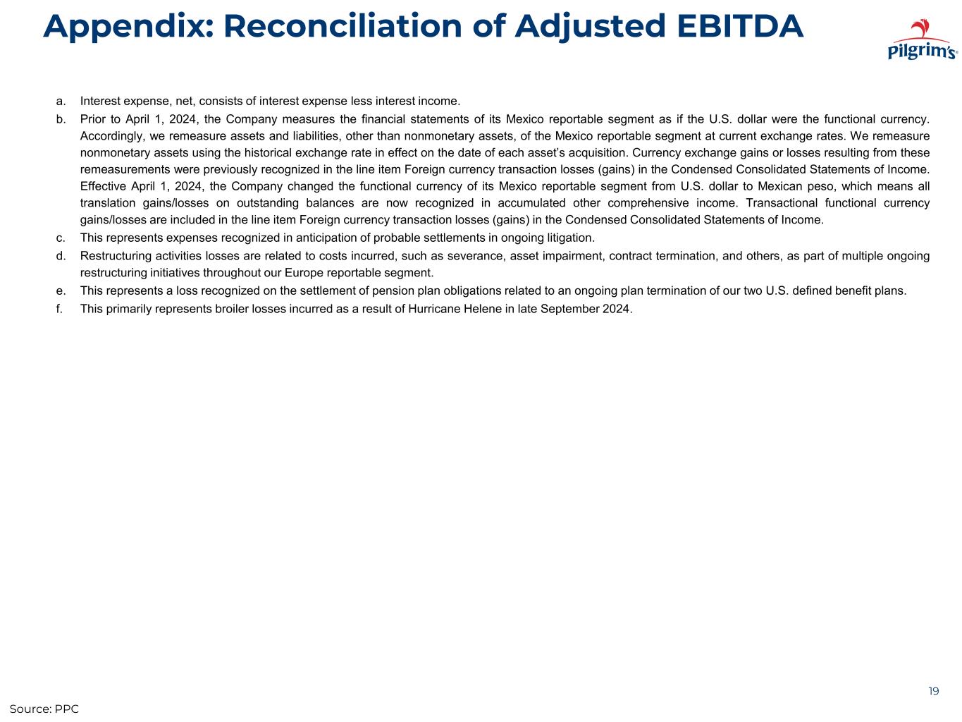 Appendix: Reconciliation of Adjusted EBITDA 18 PILGRIM'S PRIDE CORPORATION Reconciliation of Adjusted EBITDA (Unaudited) Three Months Ended Year Ended December 28, 2025 December 29, 2024 December 28, 2025 December 29, 2024 (In thousands) Net income (loss) $ 87,931 $ 235,772 $ 1,083,344 $ 1,087,223 Add: Interest expense, net(a) 33,044 22,776 110,270 88,509 Income tax expense 86,803 40,725 418,794 325,046 Depreciation and amortization 121,709 111,854 456,157 433,622 EBITDA 329,487 411,127 2,068,565 1,934,400 Add: Foreign currency transaction loss (gain)(b) (1,231) (2,785) 6,777 (10,025) Litigation settlements(c) 77,363 95,038 162,659 167,228 Restructuring activities losses(d) 9,464 11,318 31,354 93,388 Loss on settlement of pension from plan termination(e) — 10,940 — 21,649 Inventory write-down as a result of hurricane(f) — — — 8,075 Minus: Net income (loss) attributable to noncontrolling interest (62) (82) 985 785 Adjusted EBITDA $ 415,145 $ 525,720 $ 2,268,370 $ 2,213,930 Source: PPC