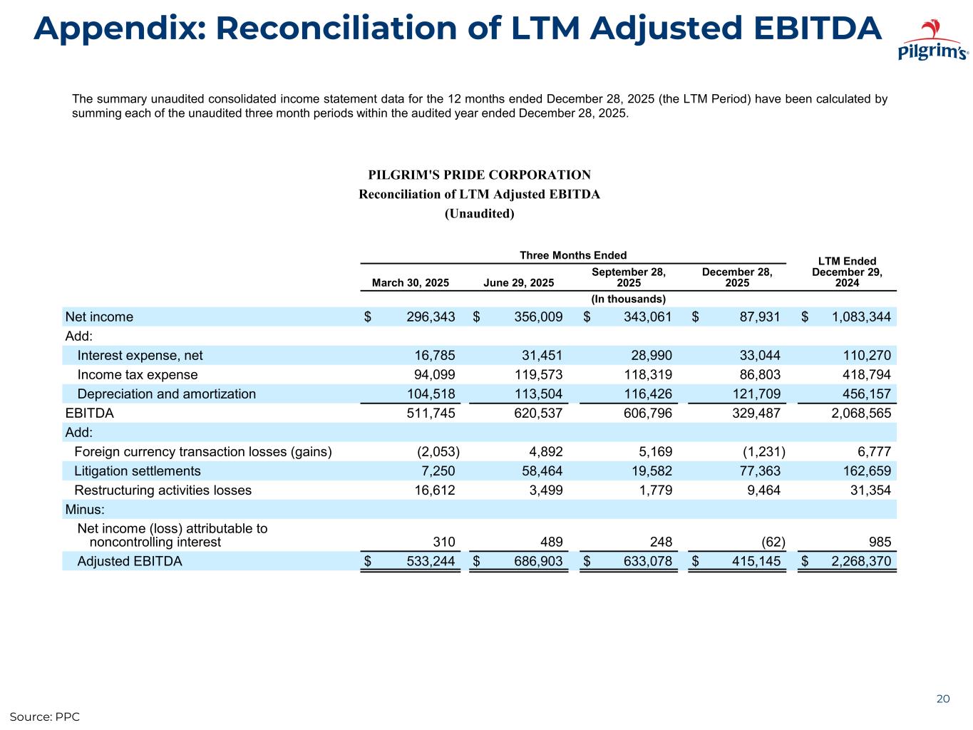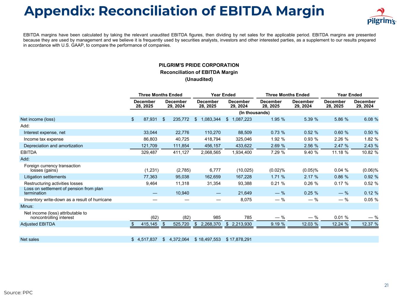 Appendix: Reconciliation of LTM Adjusted EBITDA 20 The summary unaudited consolidated income statement data for the 12 months ended December 28, 2025 (the LTM Period) have been calculated by summing each of the unaudited three month periods within the audited year ended December 28, 2025. PILGRIM'S PRIDE CORPORATION Reconciliation of LTM Adjusted EBITDA (Unaudited) Three Months Ended LTM Ended December 29, 2024March 30, 2025 June 29, 2025 September 28, 2025 December 28, 2025 (In thousands) Net income $ 296,343 $ 356,009 $ 343,061 $ 87,931 $ 1,083,344 Add: Interest expense, net 16,785 31,451 28,990 33,044 110,270 Income tax expense 94,099 119,573 118,319 86,803 418,794 Depreciation and amortization 104,518 113,504 116,426 121,709 456,157 EBITDA 511,745 620,537 606,796 329,487 2,068,565 Add: Foreign currency transaction losses (gains) (2,053) 4,892 5,169 (1,231) 6,777 Litigation settlements 7,250 58,464 19,582 77,363 162,659 Restructuring activities losses 16,612 3,499 1,779 9,464 31,354 Minus: Net income (loss) attributable to noncontrolling interest 310 489 248 (62) 985 Adjusted EBITDA $ 533,244 $ 686,903 $ 633,078 $ 415,145 $ 2,268,370 Source: PPC