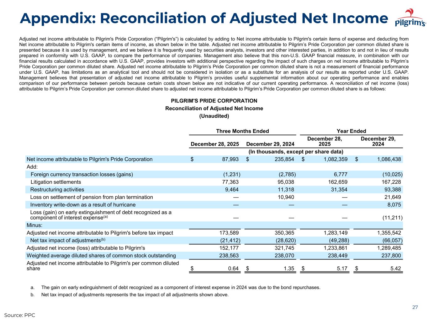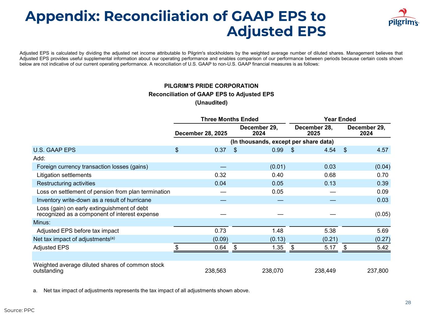 Appendix: Reconciliation of Adjusted Net Income 27 Adjusted net income attributable to Pilgrim's Pride Corporation (“Pilgrim's”) is calculated by adding to Net income attributable to Pilgrim's certain items of expense and deducting from Net income attributable to Pilgrim's certain items of income, as shown below in the table. Adjusted net income attributable to Pilgrim’s Pride Corporation per common diluted share is presented because it is used by management, and we believe it is frequently used by securities analysts, investors and other interested parties, in addition to and not in lieu of results prepared in conformity with U.S. GAAP, to compare the performance of companies. Management also believe that this non-U.S. GAAP financial measure, in combination with our financial results calculated in accordance with U.S. GAAP, provides investors with additional perspective regarding the impact of such charges on net income attributable to Pilgrim’s Pride Corporation per common diluted share. Adjusted net income attributable to Pilgrim’s Pride Corporation per common diluted share is not a measurement of financial performance under U.S. GAAP, has limitations as an analytical tool and should not be considered in isolation or as a substitute for an analysis of our results as reported under U.S. GAAP. Management believes that presentation of adjusted net income attributable to Pilgrim’s provides useful supplemental information about our operating performance and enables comparison of our performance between periods because certain costs shown below are not indicative of our current operating performance. A reconciliation of net income (loss) attributable to Pilgrim’s Pride Corporation per common diluted share to adjusted net income attributable to Pilgrim’s Pride Corporation per common diluted share is as follows: PILGRIM'S PRIDE CORPORATION Reconciliation of Adjusted Net Income (Unaudited) Three Months Ended Year Ended December 28, 2025 December 29, 2024 December 28, 2025 December 29, 2024 (In thousands, except per share data) Net income attributable to Pilgrim's Pride Corporation $ 87,993 $ 235,854 $ 1,082,359 $ 1,086,438 Add: Foreign currency transaction losses (gains) (1,231) (2,785) 6,777 (10,025) Litigation settlements 77,363 95,038 162,659 167,228 Restructuring activities 9,464 11,318 31,354 93,388 Loss on settlement of pension from plan termination — 10,940 — 21,649 Inventory write-down as a result of hurricane — — — 8,075 Loss (gain) on early extinguishment of debt recognized as a component of interest expense(a) — — — (11,211) Minus: Adjusted net income attributable to Pilgrim's before tax impact 173,589 350,365 1,283,149 1,355,542 Net tax impact of adjustments(b) (21,412) (28,620) (49,288) (66,057) Adjusted net income (loss) attributable to Pilgrim's 152,177 321,745 1,233,861 1,289,485 Weighted average diluted shares of common stock outstanding 238,563 238,070 238,449 237,800 Adjusted net income attributable to Pilgrim's per common diluted share $ 0.64 $ 1.35 $ 5.17 $ 5.42 a. The gain on early extinguishment of debt recognized as a component of interest expense in 2024 was due to the bond repurchases. b. Net tax impact of adjustments represents the tax impact of all adjustments shown above. Source: PPC