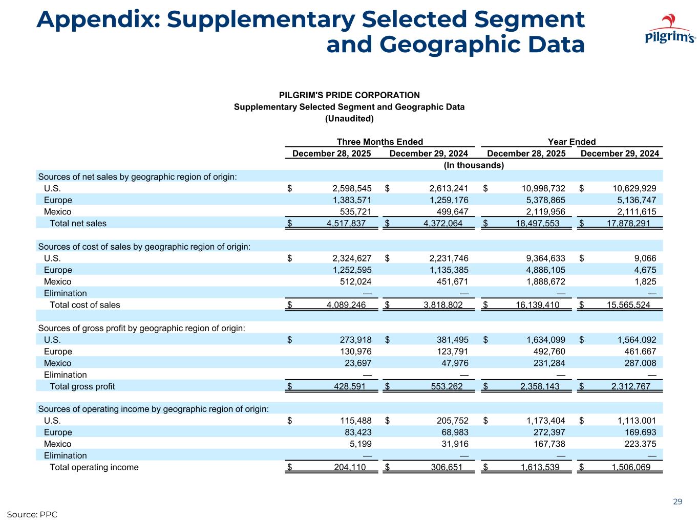 Appendix: Supplementary Selected Segment and Geographic Data 29 PILGRIM'S PRIDE CORPORATION Supplementary Selected Segment and Geographic Data (Unaudited) Three Months Ended Year Ended December 28, 2025 December 29, 2024 December 28, 2025 December 29, 2024 (In thousands) Sources of net sales by geographic region of origin: U.S. $ 2,598,545 $ 2,613,241 $ 10,998,732 $ 10,629,929 Europe 1,383,571 1,259,176 5,378,865 5,136,747 Mexico 535,721 499,647 2,119,956 2,111,615 Total net sales $ 4,517,837 $ 4,372,064 $ 18,497,553 $ 17,878,291 Sources of cost of sales by geographic region of origin: U.S. $ 2,324,627 $ 2,231,746 9,364,633 $ 9,066 Europe 1,252,595 1,135,385 4,886,105 4,675 Mexico 512,024 451,671 1,888,672 1,825 Elimination — — — — Total cost of sales $ 4,089,246 $ 3,818,802 $ 16,139,410 $ 15,565,524 Sources of gross profit by geographic region of origin: U.S. $ 273,918 $ 381,495 $ 1,634,099 $ 1,564.092 Europe 130,976 123,791 492,760 461.667 Mexico 23,697 47,976 231,284 287.008 Elimination — — — — Total gross profit $ 428,591 $ 553,262 $ 2,358,143 $ 2,312,767 Sources of operating income by geographic region of origin: U.S. $ 115,488 $ 205,752 $ 1,173,404 $ 1,113.001 Europe 83,423 68,983 272,397 169.693 Mexico 5,199 31,916 167,738 223.375 Elimination — — — — Total operating income $ 204,110 $ 306,651 $ 1,613,539 $ 1,506,069 Source: PPC