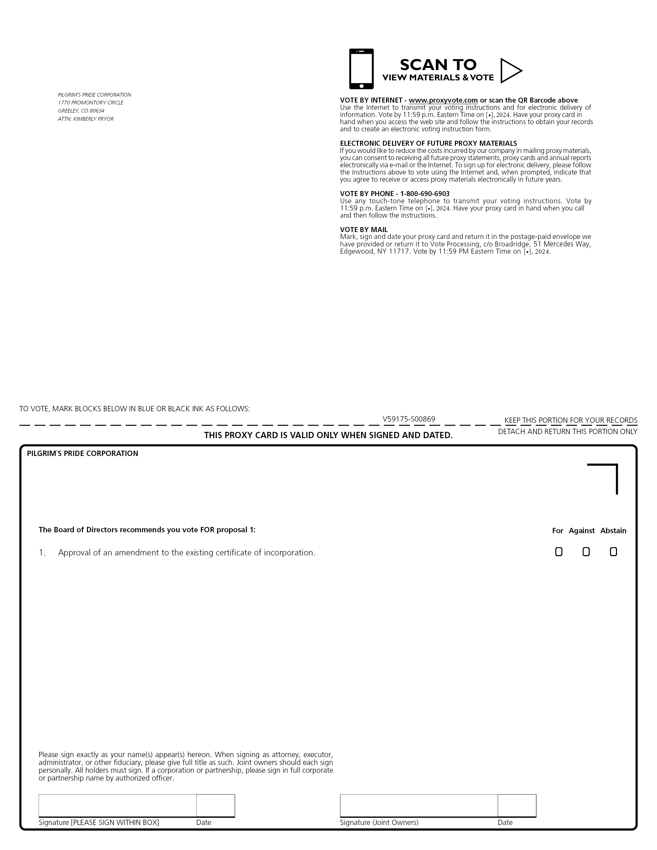 SCAN TO VIEW MATERIALS & VOTE PILGRIM’S PRIDE CORPORATION 1770 PROMONTORY CIRCLE GREELEY, CO 80634 ATTN: KIMBERLY PRYOR VOTE BY INTERNET - www.proxyvote.com or scan the QR Barcode above Use the Internet to transmit your voting instructions and for electronic delivery of information. Vote by 11:59 p.m. Eastern Time on [], 2024. Have your proxy card in hand when you access the web site and follow the instructions to obtain your records and to create an electronic voting instruction form. ELECTRONIC DELIVERY OF FUTURE PROXY MATERIALS If you would like to reduce the costs incurred by our company in mailing proxy materials, you can consent to receiving all future proxy statements, proxy cards and annual reports electronically via e-mail or the Internet. To sign up for electronic delivery, please follow the instructions above to vote using the Internet and, when prompted, indicate that you agree to receive or access proxy materials electronically in future years. VOTE BY PHONE - 1-800-690-6903 Use any touch-tone telephone to transmit your voting instructions. Vote by 11:59 p.m. Eastern Time on [], 2024. Have your proxy card in hand when you call and then follow the instructions. VOTE BY MAIL Mark, sign and date your proxy card and return it in the postage-paid envelope we have provided or return it to Vote Processing, c/o Broadridge, 51 Mercedes Way, Edgewood, NY 11717. Vote by 11:59 PM Eastern Time on [], 2024. TO VOTE, MARK BLOCKS BELOW IN BLUE OR BLACK INK AS FOLLOWS: V59175-S00869 KEEP THIS PORTION FOR YOUR RECORDS THIS PROXY CARD IS VALID ONLY WHEN SIGNED AND DATED. DETACH AND RETURN THIS PORTION ONLY The Board of Directors recommends you vote FOR proposal 1: 1. Approval of an amendment to the existing certificate of incorporation. For Against Abstain