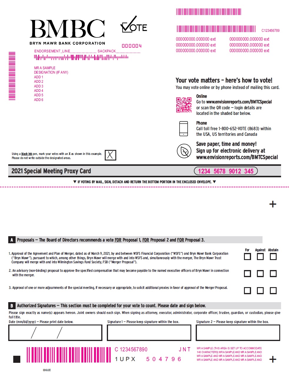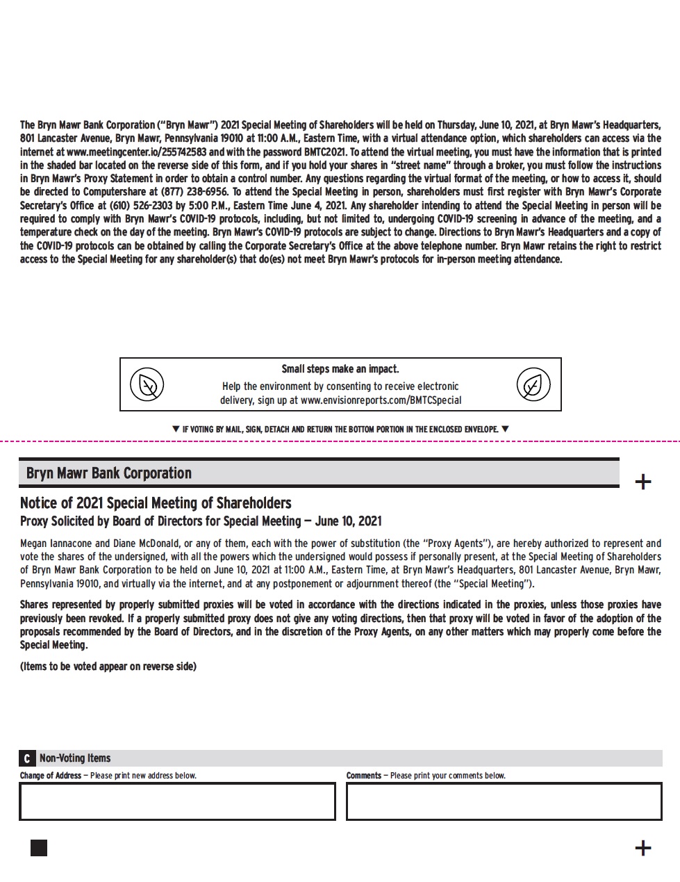 The Bryn Mawr Bank Corporation (“Bryn Mawr”) 2021 Special Meeting of Shareholders will be held on Thursday, June 10, 2021, at Bryn Mawr’s Headquarters, 801 Lancaster Avenue, Bryn Mawr, Pennsylvania 19010 at 11:00 A.M., Eastern Time, with a virtual attendance option, which shareholders can access via the internet at www.meetingcenter.io/255742583 and with the password BMTC2021. To attend the virtual meeting, you must have the information that is printed in the shaded bar located on the reverse side of this form, and if you hold your shares in “street name” through a broker, you must follow the instructions in Bryn Mawr’s Proxy Statement in order to obtain a control number. Any questions regarding the virtual format of the meeting, or how to access it, should be directed to Computershare at (877) 238-6956. To attend the Special Meeting in person, shareholders must first register with Bryn Mawr’s Corporate Secretary’s Office at (610) 526-2303 by 5:00 P.M., Eastern Time June 4, 2021. Any shareholder intending to attend the Special Meeting in person will be required to comply with Bryn Mawr’s COVID-19 protocols, including, but not limited to, undergoing COVID-19 screening in advance of the meeting, and a temperature check on the day of the meeting. Bryn Mawr’s COVID-19 protocols are subject to change. Directions to Bryn Mawr’s Headquarters and a copy of the COVID-19 protocols can be obtained by calling the Corporate Secretary’s Office at the above telephone number. Bryn Mawr retains the right to restrict access to the Special Meeting for any shareholder(s) that do(es) not meet Bryn Mawr’s protocols for in-person meeting attendance. Small steps make an impact. Help the environment by consenting to receive electronic delivery, sign up at www.envisionreports.com/BMTCSpecial IF VOTING BY MAIL, SIGN, DETACH AND RETURN THE BOTTOM PORTION IN THE ENCLOSED ENVELOPE. Bryn Mawr Bank Corporation Notice of 2021 Special Meeting of Shareholders Proxy Solicited by Board of Directors for Special Meeting — June 10, 2021 Megan Iannacone and Diane McDonald, or any of them, each with the power of substitution (the “Proxy Agents”), are hereby authorized to represent and vote the shares of the undersigned, with all the powers which the undersigned would possess if personally present, at the Special Meeting of Shareholders of Bryn Mawr Bank Corporation to be held on June 10, 2021 at 11:00 A.M., Eastern Time, at Bryn Mawr’s Headquarters, 801 Lancaster Avenue, Bryn Mawr, Pennsylvania 19010, and virtually via the internet, and at any postponement or adjournment thereof (the “Special Meeting”). Shares represented by properly submitted proxies will be voted in accordance with the directions indicated in the proxies, unless those proxies have previously been revoked. If a properly submitted proxy does not give any voting directions, then that proxy will be voted in favor of the adoption of the proposals recommended by the Board of Directors, and in the discretion of the Proxy Agents, on any other matters which may properly come before the Special Meeting. (Items to be voted appear on reverse side) C Non-Voting Items Change of Address — Please print new address below. Comments — Please print your comments below.