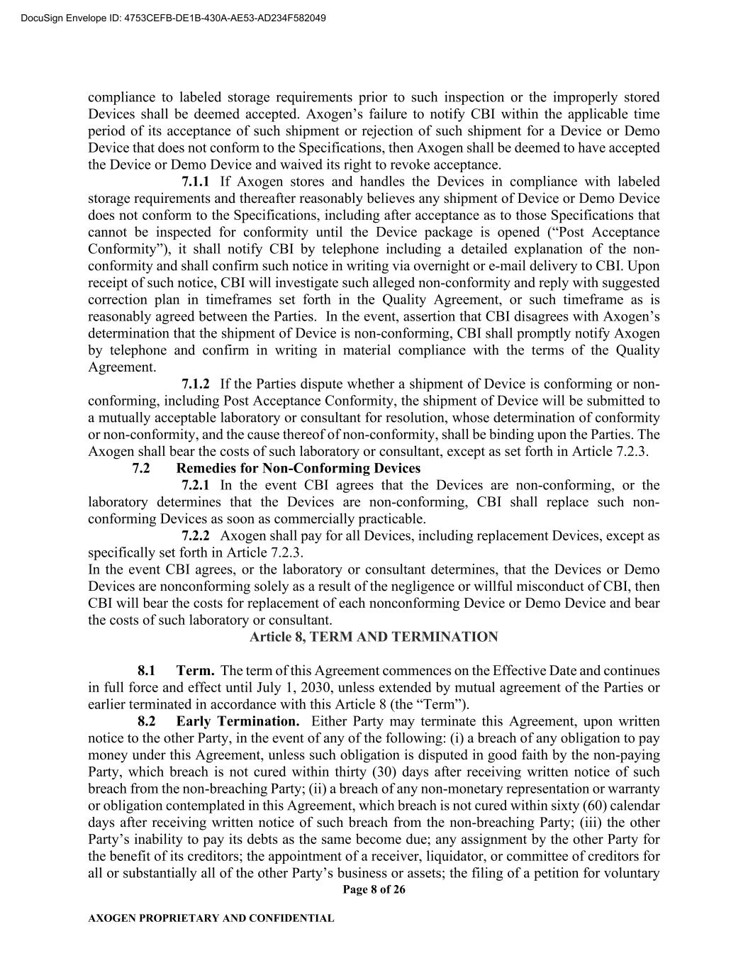 AXOGEN PROPRIETARY AND CONFIDENTIAL Page 8 of 26 compliance to labeled storage requirements prior to such inspection or the improperly stored Devices shall be deemed accepted. Axogen’s failure to notify CBI within the applicable time period of its acceptance of such shipment or rejection of such shipment for a Device or Demo Device that does not conform to the Specifications, then Axogen shall be deemed to have accepted the Device or Demo Device and waived its right to revoke acceptance. 7.1.1 If Axogen stores and handles the Devices in compliance with labeled storage requirements and thereafter reasonably believes any shipment of Device or Demo Device does not conform to the Specifications, including after acceptance as to those Specifications that cannot be inspected for conformity until the Device package is opened (“Post Acceptance Conformity”), it shall notify CBI by telephone including a detailed explanation of the non- conformity and shall confirm such notice in writing via overnight or e-mail delivery to CBI. Upon receipt of such notice, CBI will investigate such alleged non-conformity and reply with suggested correction plan in timeframes set forth in the Quality Agreement, or such timeframe as is reasonably agreed between the Parties. In the event, assertion that CBI disagrees with Axogen’s determination that the shipment of Device is non-conforming, CBI shall promptly notify Axogen by telephone and confirm in writing in material compliance with the terms of the Quality Agreement. 7.1.2 If the Parties dispute whether a shipment of Device is conforming or non- conforming, including Post Acceptance Conformity, the shipment of Device will be submitted to a mutually acceptable laboratory or consultant for resolution, whose determination of conformity or non-conformity, and the cause thereof of non-conformity, shall be binding upon the Parties. The Axogen shall bear the costs of such laboratory or consultant, except as set forth in Article 7.2.3. 7.2 Remedies for Non-Conforming Devices 7.2.1 In the event CBI agrees that the Devices are non-conforming, or the laboratory determines that the Devices are non-conforming, CBI shall replace such non- conforming Devices as soon as commercially practicable. 7.2.2 Axogen shall pay for all Devices, including replacement Devices, except as specifically set forth in Article 7.2.3. In the event CBI agrees, or the laboratory or consultant determines, that the Devices or Demo Devices are nonconforming solely as a result of the negligence or willful misconduct of CBI, then CBI will bear the costs for replacement of each nonconforming Device or Demo Device and bear the costs of such laboratory or consultant. Article 8, TERM AND TERMINATION 8.1 Term. The term of this Agreement commences on the Effective Date and continues in full force and effect until July 1, 2030, unless extended by mutual agreement of the Parties or earlier terminated in accordance with this Article 8 (the “Term”). 8.2 Early Termination. Either Party may terminate this Agreement, upon written notice to the other Party, in the event of any of the following: (i) a breach of any obligation to pay money under this Agreement, unless such obligation is disputed in good faith by the non-paying Party, which breach is not cured within thirty (30) days after receiving written notice of such breach from the non-breaching Party; (ii) a breach of any non-monetary representation or warranty or obligation contemplated in this Agreement, which breach is not cured within sixty (60) calendar days after receiving written notice of such breach from the non-breaching Party; (iii) the other Party’s inability to pay its debts as the same become due; any assignment by the other Party for the benefit of its creditors; the appointment of a receiver, liquidator, or committee of creditors for all or substantially all of the other Party’s business or assets; the filing of a petition for voluntary DocuSign Envelope ID: 4753CEFB-DE1B-430A-AE53-AD234F582049