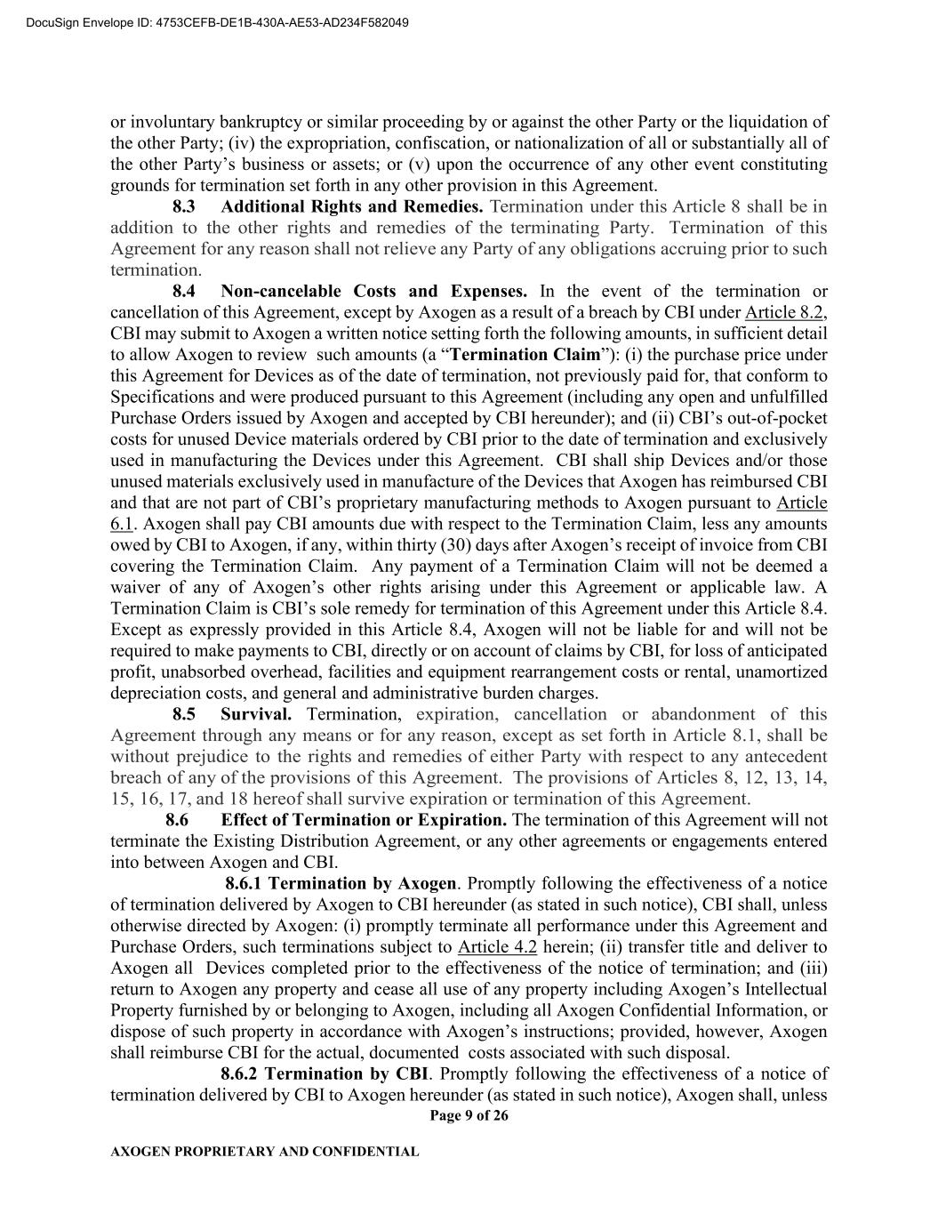 AXOGEN PROPRIETARY AND CONFIDENTIAL Page 9 of 26 or involuntary bankruptcy or similar proceeding by or against the other Party or the liquidation of the other Party; (iv) the expropriation, confiscation, or nationalization of all or substantially all of the other Party’s business or assets; or (v) upon the occurrence of any other event constituting grounds for termination set forth in any other provision in this Agreement. 8.3 Additional Rights and Remedies. Termination under this Article 8 shall be in addition to the other rights and remedies of the terminating Party. Termination of this Agreement for any reason shall not relieve any Party of any obligations accruing prior to such termination. 8.4 Non-cancelable Costs and Expenses. In the event of the termination or cancellation of this Agreement, except by Axogen as a result of a breach by CBI under Article 8.2, CBI may submit to Axogen a written notice setting forth the following amounts, in sufficient detail to allow Axogen to review such amounts (a “Termination Claim”): (i) the purchase price under this Agreement for Devices as of the date of termination, not previously paid for, that conform to Specifications and were produced pursuant to this Agreement (including any open and unfulfilled Purchase Orders issued by Axogen and accepted by CBI hereunder); and (ii) CBI’s out-of-pocket costs for unused Device materials ordered by CBI prior to the date of termination and exclusively used in manufacturing the Devices under this Agreement. CBI shall ship Devices and/or those unused materials exclusively used in manufacture of the Devices that Axogen has reimbursed CBI and that are not part of CBI’s proprietary manufacturing methods to Axogen pursuant to Article 6.1. Axogen shall pay CBI amounts due with respect to the Termination Claim, less any amounts owed by CBI to Axogen, if any, within thirty (30) days after Axogen’s receipt of invoice from CBI covering the Termination Claim. Any payment of a Termination Claim will not be deemed a waiver of any of Axogen’s other rights arising under this Agreement or applicable law. A Termination Claim is CBI’s sole remedy for termination of this Agreement under this Article 8.4. Except as expressly provided in this Article 8.4, Axogen will not be liable for and will not be required to make payments to CBI, directly or on account of claims by CBI, for loss of anticipated profit, unabsorbed overhead, facilities and equipment rearrangement costs or rental, unamortized depreciation costs, and general and administrative burden charges. 8.5 Survival. Termination, expiration, cancellation or abandonment of this Agreement through any means or for any reason, except as set forth in Article 8.1, shall be without prejudice to the rights and remedies of either Party with respect to any antecedent breach of any of the provisions of this Agreement. The provisions of Articles 8, 12, 13, 14, 15, 16, 17, and 18 hereof shall survive expiration or termination of this Agreement. 8.6 Effect of Termination or Expiration. The termination of this Agreement will not terminate the Existing Distribution Agreement, or any other agreements or engagements entered into between Axogen and CBI. 8.6.1 Termination by Axogen. Promptly following the effectiveness of a notice of termination delivered by Axogen to CBI hereunder (as stated in such notice), CBI shall, unless otherwise directed by Axogen: (i) promptly terminate all performance under this Agreement and Purchase Orders, such terminations subject to Article 4.2 herein; (ii) transfer title and deliver to Axogen all Devices completed prior to the effectiveness of the notice of termination; and (iii) return to Axogen any property and cease all use of any property including Axogen’s Intellectual Property furnished by or belonging to Axogen, including all Axogen Confidential Information, or dispose of such property in accordance with Axogen’s instructions; provided, however, Axogen shall reimburse CBI for the actual, documented costs associated with such disposal. 8.6.2 Termination by CBI. Promptly following the effectiveness of a notice of termination delivered by CBI to Axogen hereunder (as stated in such notice), Axogen shall, unless DocuSign Envelope ID: 4753CEFB-DE1B-430A-AE53-AD234F582049