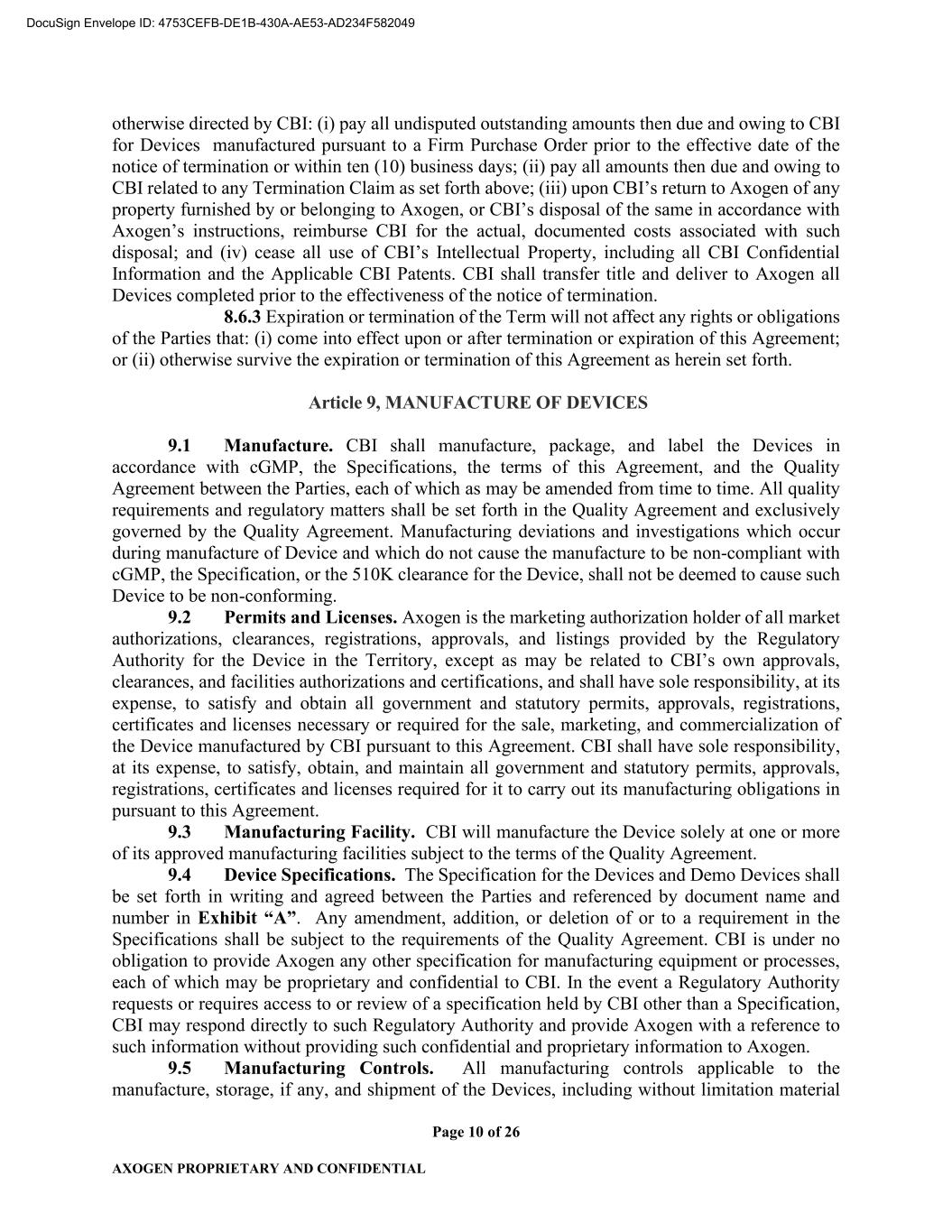 AXOGEN PROPRIETARY AND CONFIDENTIAL Page 10 of 26 otherwise directed by CBI: (i) pay all undisputed outstanding amounts then due and owing to CBI for Devices manufactured pursuant to a Firm Purchase Order prior to the effective date of the notice of termination or within ten (10) business days; (ii) pay all amounts then due and owing to CBI related to any Termination Claim as set forth above; (iii) upon CBI’s return to Axogen of any property furnished by or belonging to Axogen, or CBI’s disposal of the same in accordance with Axogen’s instructions, reimburse CBI for the actual, documented costs associated with such disposal; and (iv) cease all use of CBI’s Intellectual Property, including all CBI Confidential Information and the Applicable CBI Patents. CBI shall transfer title and deliver to Axogen all Devices completed prior to the effectiveness of the notice of termination. 8.6.3 Expiration or termination of the Term will not affect any rights or obligations of the Parties that: (i) come into effect upon or after termination or expiration of this Agreement; or (ii) otherwise survive the expiration or termination of this Agreement as herein set forth. Article 9, MANUFACTURE OF DEVICES 9.1 Manufacture. CBI shall manufacture, package, and label the Devices in accordance with cGMP, the Specifications, the terms of this Agreement, and the Quality Agreement between the Parties, each of which as may be amended from time to time. All quality requirements and regulatory matters shall be set forth in the Quality Agreement and exclusively governed by the Quality Agreement. Manufacturing deviations and investigations which occur during manufacture of Device and which do not cause the manufacture to be non-compliant with cGMP, the Specification, or the 510K clearance for the Device, shall not be deemed to cause such Device to be non-conforming. 9.2 Permits and Licenses. Axogen is the marketing authorization holder of all market authorizations, clearances, registrations, approvals, and listings provided by the Regulatory Authority for the Device in the Territory, except as may be related to CBI’s own approvals, clearances, and facilities authorizations and certifications, and shall have sole responsibility, at its expense, to satisfy and obtain all government and statutory permits, approvals, registrations, certificates and licenses necessary or required for the sale, marketing, and commercialization of the Device manufactured by CBI pursuant to this Agreement. CBI shall have sole responsibility, at its expense, to satisfy, obtain, and maintain all government and statutory permits, approvals, registrations, certificates and licenses required for it to carry out its manufacturing obligations in pursuant to this Agreement. 9.3 Manufacturing Facility. CBI will manufacture the Device solely at one or more of its approved manufacturing facilities subject to the terms of the Quality Agreement. 9.4 Device Specifications. The Specification for the Devices and Demo Devices shall be set forth in writing and agreed between the Parties and referenced by document name and number in Exhibit “A”. Any amendment, addition, or deletion of or to a requirement in the Specifications shall be subject to the requirements of the Quality Agreement. CBI is under no obligation to provide Axogen any other specification for manufacturing equipment or processes, each of which may be proprietary and confidential to CBI. In the event a Regulatory Authority requests or requires access to or review of a specification held by CBI other than a Specification, CBI may respond directly to such Regulatory Authority and provide Axogen with a reference to such information without providing such confidential and proprietary information to Axogen. 9.5 Manufacturing Controls. All manufacturing controls applicable to the manufacture, storage, if any, and shipment of the Devices, including without limitation material DocuSign Envelope ID: 4753CEFB-DE1B-430A-AE53-AD234F582049