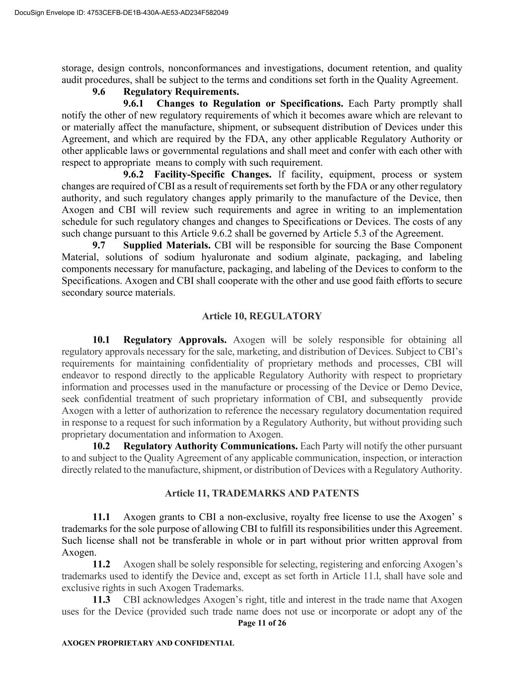 AXOGEN PROPRIETARY AND CONFIDENTIAL Page 11 of 26 storage, design controls, nonconformances and investigations, document retention, and quality audit procedures, shall be subject to the terms and conditions set forth in the Quality Agreement. 9.6 Regulatory Requirements. 9.6.1 Changes to Regulation or Specifications. Each Party promptly shall notify the other of new regulatory requirements of which it becomes aware which are relevant to or materially affect the manufacture, shipment, or subsequent distribution of Devices under this Agreement, and which are required by the FDA, any other applicable Regulatory Authority or other applicable laws or governmental regulations and shall meet and confer with each other with respect to appropriate means to comply with such requirement. 9.6.2 Facility-Specific Changes. If facility, equipment, process or system changes are required of CBI as a result of requirements set forth by the FDA or any other regulatory authority, and such regulatory changes apply primarily to the manufacture of the Device, then Axogen and CBI will review such requirements and agree in writing to an implementation schedule for such regulatory changes and changes to Specifications or Devices. The costs of any such change pursuant to this Article 9.6.2 shall be governed by Article 5.3 of the Agreement. 9.7 Supplied Materials. CBI will be responsible for sourcing the Base Component Material, solutions of sodium hyaluronate and sodium alginate, packaging, and labeling components necessary for manufacture, packaging, and labeling of the Devices to conform to the Specifications. Axogen and CBI shall cooperate with the other and use good faith efforts to secure secondary source materials. Article 10, REGULATORY 10.1 Regulatory Approvals. Axogen will be solely responsible for obtaining all regulatory approvals necessary for the sale, marketing, and distribution of Devices. Subject to CBI’s requirements for maintaining confidentiality of proprietary methods and processes, CBI will endeavor to respond directly to the applicable Regulatory Authority with respect to proprietary information and processes used in the manufacture or processing of the Device or Demo Device, seek confidential treatment of such proprietary information of CBI, and subsequently provide Axogen with a letter of authorization to reference the necessary regulatory documentation required in response to a request for such information by a Regulatory Authority, but without providing such proprietary documentation and information to Axogen. 10.2 Regulatory Authority Communications. Each Party will notify the other pursuant to and subject to the Quality Agreement of any applicable communication, inspection, or interaction directly related to the manufacture, shipment, or distribution of Devices with a Regulatory Authority. Article 11, TRADEMARKS AND PATENTS 11.1 Axogen grants to CBI a non-exclusive, royalty free license to use the Axogen’ s trademarks for the sole purpose of allowing CBI to fulfill its responsibilities under this Agreement. Such license shall not be transferable in whole or in part without prior written approval from Axogen. 11.2 Axogen shall be solely responsible for selecting, registering and enforcing Axogen’s trademarks used to identify the Device and, except as set forth in Article 11.l, shall have sole and exclusive rights in such Axogen Trademarks. 11.3 CBI acknowledges Axogen’s right, title and interest in the trade name that Axogen uses for the Device (provided such trade name does not use or incorporate or adopt any of the DocuSign Envelope ID: 4753CEFB-DE1B-430A-AE53-AD234F582049