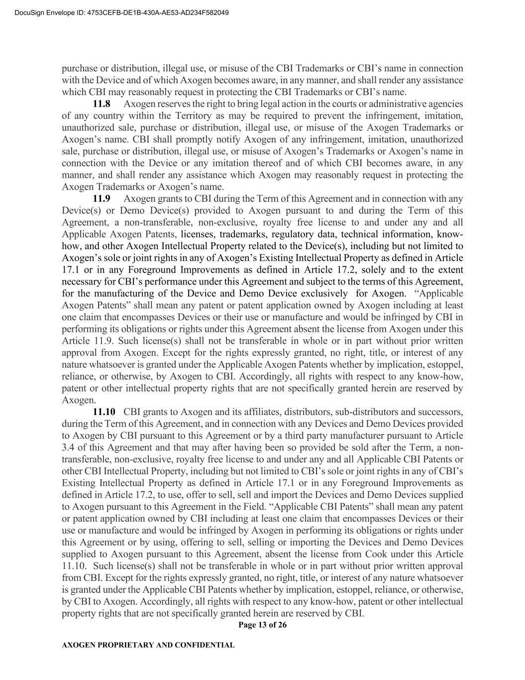 AXOGEN PROPRIETARY AND CONFIDENTIAL Page 13 of 26 purchase or distribution, illegal use, or misuse of the CBI Trademarks or CBI’s name in connection with the Device and of which Axogen becomes aware, in any manner, and shall render any assistance which CBI may reasonably request in protecting the CBI Trademarks or CBI’s name. 11.8 Axogen reserves the right to bring legal action in the courts or administrative agencies of any country within the Territory as may be required to prevent the infringement, imitation, unauthorized sale, purchase or distribution, illegal use, or misuse of the Axogen Trademarks or Axogen’s name. CBI shall promptly notify Axogen of any infringement, imitation, unauthorized sale, purchase or distribution, illegal use, or misuse of Axogen’s Trademarks or Axogen’s name in connection with the Device or any imitation thereof and of which CBI becomes aware, in any manner, and shall render any assistance which Axogen may reasonably request in protecting the Axogen Trademarks or Axogen’s name. 11.9 Axogen grants to CBI during the Term of this Agreement and in connection with any Device(s) or Demo Device(s) provided to Axogen pursuant to and during the Term of this Agreement, a non-transferable, non-exclusive, royalty free license to and under any and all Applicable Axogen Patents, licenses, trademarks, regulatory data, technical information, know- how, and other Axogen Intellectual Property related to the Device(s), including but not limited to Axogen’s sole or joint rights in any of Axogen’s Existing Intellectual Property as defined in Article 17.1 or in any Foreground Improvements as defined in Article 17.2, solely and to the extent necessary for CBI’s performance under this Agreement and subject to the terms of this Agreement, for the manufacturing of the Device and Demo Device exclusively for Axogen. “Applicable Axogen Patents” shall mean any patent or patent application owned by Axogen including at least one claim that encompasses Devices or their use or manufacture and would be infringed by CBI in performing its obligations or rights under this Agreement absent the license from Axogen under this Article 11.9. Such license(s) shall not be transferable in whole or in part without prior written approval from Axogen. Except for the rights expressly granted, no right, title, or interest of any nature whatsoever is granted under the Applicable Axogen Patents whether by implication, estoppel, reliance, or otherwise, by Axogen to CBI. Accordingly, all rights with respect to any know-how, patent or other intellectual property rights that are not specifically granted herein are reserved by Axogen. 11.10 CBI grants to Axogen and its affiliates, distributors, sub-distributors and successors, during the Term of this Agreement, and in connection with any Devices and Demo Devices provided to Axogen by CBI pursuant to this Agreement or by a third party manufacturer pursuant to Article 3.4 of this Agreement and that may after having been so provided be sold after the Term, a non- transferable, non-exclusive, royalty free license to and under any and all Applicable CBI Patents or other CBI Intellectual Property, including but not limited to CBI’s sole or joint rights in any of CBI’s Existing Intellectual Property as defined in Article 17.1 or in any Foreground Improvements as defined in Article 17.2, to use, offer to sell, sell and import the Devices and Demo Devices supplied to Axogen pursuant to this Agreement in the Field. “Applicable CBI Patents” shall mean any patent or patent application owned by CBI including at least one claim that encompasses Devices or their use or manufacture and would be infringed by Axogen in performing its obligations or rights under this Agreement or by using, offering to sell, selling or importing the Devices and Demo Devices supplied to Axogen pursuant to this Agreement, absent the license from Cook under this Article 11.10. Such license(s) shall not be transferable in whole or in part without prior written approval from CBI. Except for the rights expressly granted, no right, title, or interest of any nature whatsoever is granted under the Applicable CBI Patents whether by implication, estoppel, reliance, or otherwise, by CBI to Axogen. Accordingly, all rights with respect to any know-how, patent or other intellectual property rights that are not specifically granted herein are reserved by CBI. DocuSign Envelope ID: 4753CEFB-DE1B-430A-AE53-AD234F582049