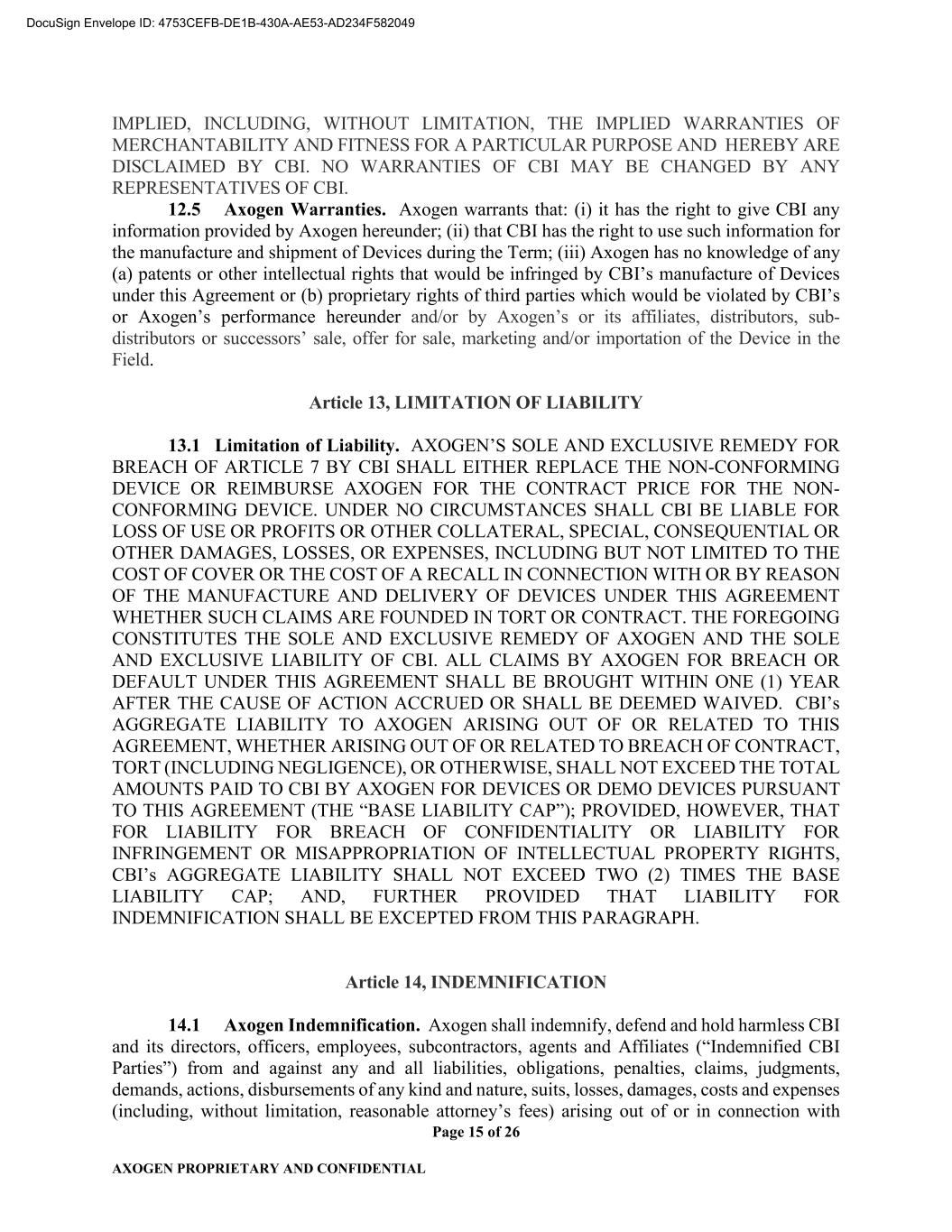 AXOGEN PROPRIETARY AND CONFIDENTIAL Page 15 of 26 IMPLIED, INCLUDING, WITHOUT LIMITATION, THE IMPLIED WARRANTIES OF MERCHANTABILITY AND FITNESS FOR A PARTICULAR PURPOSE AND HEREBY ARE DISCLAIMED BY CBI. NO WARRANTIES OF CBI MAY BE CHANGED BY ANY REPRESENTATIVES OF CBI. 12.5 Axogen Warranties. Axogen warrants that: (i) it has the right to give CBI any information provided by Axogen hereunder; (ii) that CBI has the right to use such information for the manufacture and shipment of Devices during the Term; (iii) Axogen has no knowledge of any (a) patents or other intellectual rights that would be infringed by CBI’s manufacture of Devices under this Agreement or (b) proprietary rights of third parties which would be violated by CBI’s or Axogen’s performance hereunder and/or by Axogen’s or its affiliates, distributors, sub- distributors or successors’ sale, offer for sale, marketing and/or importation of the Device in the Field. Article 13, LIMITATION OF LIABILITY 13.1 Limitation of Liability. AXOGEN’S SOLE AND EXCLUSIVE REMEDY FOR BREACH OF ARTICLE 7 BY CBI SHALL EITHER REPLACE THE NON-CONFORMING DEVICE OR REIMBURSE AXOGEN FOR THE CONTRACT PRICE FOR THE NON- CONFORMING DEVICE. UNDER NO CIRCUMSTANCES SHALL CBI BE LIABLE FOR LOSS OF USE OR PROFITS OR OTHER COLLATERAL, SPECIAL, CONSEQUENTIAL OR OTHER DAMAGES, LOSSES, OR EXPENSES, INCLUDING BUT NOT LIMITED TO THE COST OF COVER OR THE COST OF A RECALL IN CONNECTION WITH OR BY REASON OF THE MANUFACTURE AND DELIVERY OF DEVICES UNDER THIS AGREEMENT WHETHER SUCH CLAIMS ARE FOUNDED IN TORT OR CONTRACT. THE FOREGOING CONSTITUTES THE SOLE AND EXCLUSIVE REMEDY OF AXOGEN AND THE SOLE AND EXCLUSIVE LIABILITY OF CBI. ALL CLAIMS BY AXOGEN FOR BREACH OR DEFAULT UNDER THIS AGREEMENT SHALL BE BROUGHT WITHIN ONE (1) YEAR AFTER THE CAUSE OF ACTION ACCRUED OR SHALL BE DEEMED WAIVED. CBI’s AGGREGATE LIABILITY TO AXOGEN ARISING OUT OF OR RELATED TO THIS AGREEMENT, WHETHER ARISING OUT OF OR RELATED TO BREACH OF CONTRACT, TORT (INCLUDING NEGLIGENCE), OR OTHERWISE, SHALL NOT EXCEED THE TOTAL AMOUNTS PAID TO CBI BY AXOGEN FOR DEVICES OR DEMO DEVICES PURSUANT TO THIS AGREEMENT (THE “BASE LIABILITY CAP”); PROVIDED, HOWEVER, THAT FOR LIABILITY FOR BREACH OF CONFIDENTIALITY OR LIABILITY FOR INFRINGEMENT OR MISAPPROPRIATION OF INTELLECTUAL PROPERTY RIGHTS, CBI’s AGGREGATE LIABILITY SHALL NOT EXCEED TWO (2) TIMES THE BASE LIABILITY CAP; AND, FURTHER PROVIDED THAT LIABILITY FOR INDEMNIFICATION SHALL BE EXCEPTED FROM THIS PARAGRAPH. Article 14, INDEMNIFICATION 14.1 Axogen Indemnification. Axogen shall indemnify, defend and hold harmless CBI and its directors, officers, employees, subcontractors, agents and Affiliates (“Indemnified CBI Parties”) from and against any and all liabilities, obligations, penalties, claims, judgments, demands, actions, disbursements of any kind and nature, suits, losses, damages, costs and expenses (including, without limitation, reasonable attorney’s fees) arising out of or in connection with DocuSign Envelope ID: 4753CEFB-DE1B-430A-AE53-AD234F582049