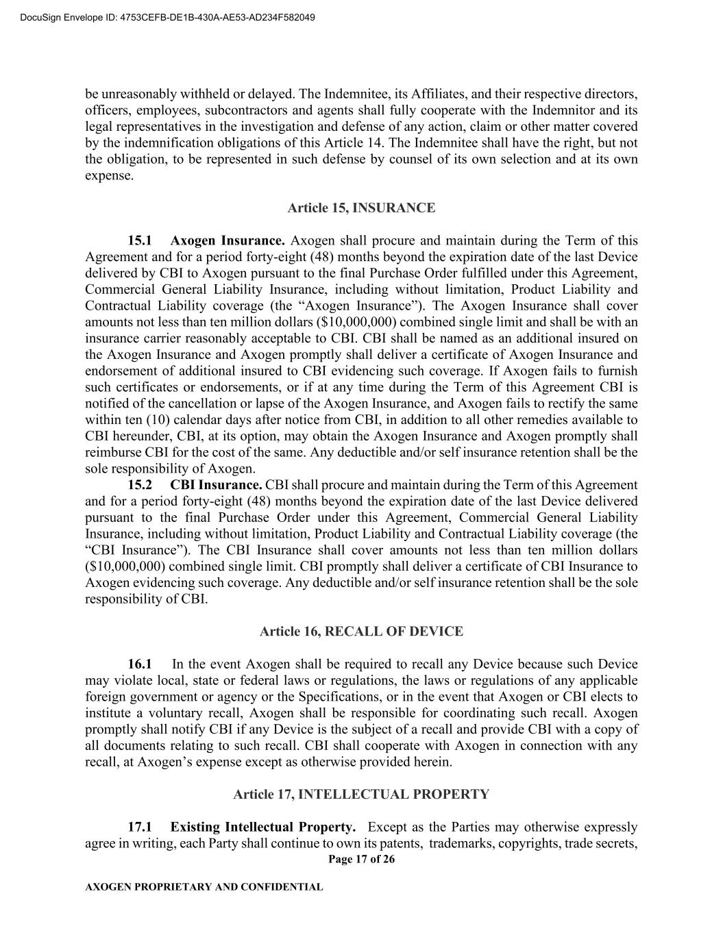 AXOGEN PROPRIETARY AND CONFIDENTIAL Page 17 of 26 be unreasonably withheld or delayed. The Indemnitee, its Affiliates, and their respective directors, officers, employees, subcontractors and agents shall fully cooperate with the Indemnitor and its legal representatives in the investigation and defense of any action, claim or other matter covered by the indemnification obligations of this Article 14. The Indemnitee shall have the right, but not the obligation, to be represented in such defense by counsel of its own selection and at its own expense. Article 15, INSURANCE 15.1 Axogen Insurance. Axogen shall procure and maintain during the Term of this Agreement and for a period forty-eight (48) months beyond the expiration date of the last Device delivered by CBI to Axogen pursuant to the final Purchase Order fulfilled under this Agreement, Commercial General Liability Insurance, including without limitation, Product Liability and Contractual Liability coverage (the “Axogen Insurance”). The Axogen Insurance shall cover amounts not less than ten million dollars ($10,000,000) combined single limit and shall be with an insurance carrier reasonably acceptable to CBI. CBI shall be named as an additional insured on the Axogen Insurance and Axogen promptly shall deliver a certificate of Axogen Insurance and endorsement of additional insured to CBI evidencing such coverage. If Axogen fails to furnish such certificates or endorsements, or if at any time during the Term of this Agreement CBI is notified of the cancellation or lapse of the Axogen Insurance, and Axogen fails to rectify the same within ten (10) calendar days after notice from CBI, in addition to all other remedies available to CBI hereunder, CBI, at its option, may obtain the Axogen Insurance and Axogen promptly shall reimburse CBI for the cost of the same. Any deductible and/or self insurance retention shall be the sole responsibility of Axogen. 15.2 CBI Insurance. CBI shall procure and maintain during the Term of this Agreement and for a period forty-eight (48) months beyond the expiration date of the last Device delivered pursuant to the final Purchase Order under this Agreement, Commercial General Liability Insurance, including without limitation, Product Liability and Contractual Liability coverage (the “CBI Insurance”). The CBI Insurance shall cover amounts not less than ten million dollars ($10,000,000) combined single limit. CBI promptly shall deliver a certificate of CBI Insurance to Axogen evidencing such coverage. Any deductible and/or self insurance retention shall be the sole responsibility of CBI. Article 16, RECALL OF DEVICE 16.1 In the event Axogen shall be required to recall any Device because such Device may violate local, state or federal laws or regulations, the laws or regulations of any applicable foreign government or agency or the Specifications, or in the event that Axogen or CBI elects to institute a voluntary recall, Axogen shall be responsible for coordinating such recall. Axogen promptly shall notify CBI if any Device is the subject of a recall and provide CBI with a copy of all documents relating to such recall. CBI shall cooperate with Axogen in connection with any recall, at Axogen’s expense except as otherwise provided herein. Article 17, INTELLECTUAL PROPERTY 17.1 Existing Intellectual Property. Except as the Parties may otherwise expressly agree in writing, each Party shall continue to own its patents, trademarks, copyrights, trade secrets, DocuSign Envelope ID: 4753CEFB-DE1B-430A-AE53-AD234F582049