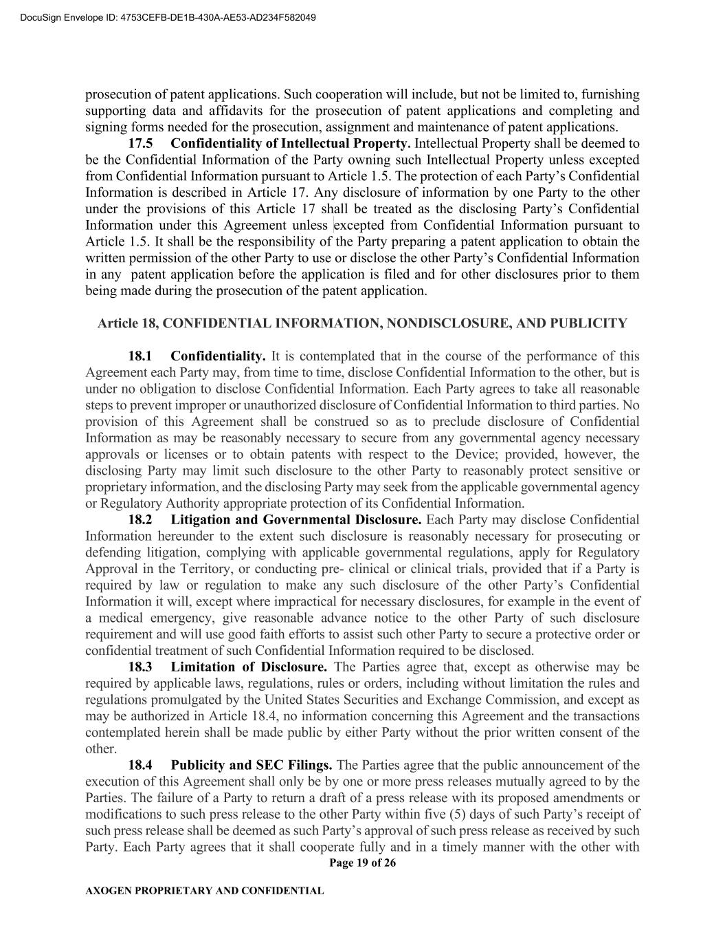 AXOGEN PROPRIETARY AND CONFIDENTIAL Page 19 of 26 prosecution of patent applications. Such cooperation will include, but not be limited to, furnishing supporting data and affidavits for the prosecution of patent applications and completing and signing forms needed for the prosecution, assignment and maintenance of patent applications. 17.5 Confidentiality of Intellectual Property. Intellectual Property shall be deemed to be the Confidential Information of the Party owning such Intellectual Property unless excepted from Confidential Information pursuant to Article 1.5. The protection of each Party’s Confidential Information is described in Article 17. Any disclosure of information by one Party to the other under the provisions of this Article 17 shall be treated as the disclosing Party’s Confidential Information under this Agreement unless excepted from Confidential Information pursuant to Article 1.5. It shall be the responsibility of the Party preparing a patent application to obtain the written permission of the other Party to use or disclose the other Party’s Confidential Information in any patent application before the application is filed and for other disclosures prior to them being made during the prosecution of the patent application. Article 18, CONFIDENTIAL INFORMATION, NONDISCLOSURE, AND PUBLICITY 18.1 Confidentiality. It is contemplated that in the course of the performance of this Agreement each Party may, from time to time, disclose Confidential Information to the other, but is under no obligation to disclose Confidential Information. Each Party agrees to take all reasonable steps to prevent improper or unauthorized disclosure of Confidential Information to third parties. No provision of this Agreement shall be construed so as to preclude disclosure of Confidential Information as may be reasonably necessary to secure from any governmental agency necessary approvals or licenses or to obtain patents with respect to the Device; provided, however, the disclosing Party may limit such disclosure to the other Party to reasonably protect sensitive or proprietary information, and the disclosing Party may seek from the applicable governmental agency or Regulatory Authority appropriate protection of its Confidential Information. 18.2 Litigation and Governmental Disclosure. Each Party may disclose Confidential Information hereunder to the extent such disclosure is reasonably necessary for prosecuting or defending litigation, complying with applicable governmental regulations, apply for Regulatory Approval in the Territory, or conducting pre- clinical or clinical trials, provided that if a Party is required by law or regulation to make any such disclosure of the other Party’s Confidential Information it will, except where impractical for necessary disclosures, for example in the event of a medical emergency, give reasonable advance notice to the other Party of such disclosure requirement and will use good faith efforts to assist such other Party to secure a protective order or confidential treatment of such Confidential Information required to be disclosed. 18.3 Limitation of Disclosure. The Parties agree that, except as otherwise may be required by applicable laws, regulations, rules or orders, including without limitation the rules and regulations promulgated by the United States Securities and Exchange Commission, and except as may be authorized in Article 18.4, no information concerning this Agreement and the transactions contemplated herein shall be made public by either Party without the prior written consent of the other. 18.4 Publicity and SEC Filings. The Parties agree that the public announcement of the execution of this Agreement shall only be by one or more press releases mutually agreed to by the Parties. The failure of a Party to return a draft of a press release with its proposed amendments or modifications to such press release to the other Party within five (5) days of such Party’s receipt of such press release shall be deemed as such Party’s approval of such press release as received by such Party. Each Party agrees that it shall cooperate fully and in a timely manner with the other with DocuSign Envelope ID: 4753CEFB-DE1B-430A-AE53-AD234F582049
