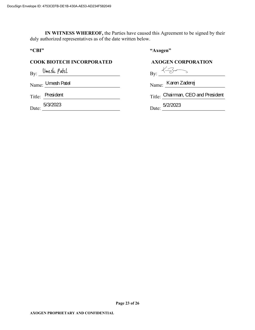 AXOGEN PROPRIETARY AND CONFIDENTIAL Page 23 of 26 IN WITNESS WHEREOF, the Parties have caused this Agreement to be signed by their duly authorized representatives as of the date written below. “CBI” “Axogen” COOK BIOTECH INCORPORATED AXOGEN CORPORATION By: By: Name: Name: Title: Title: Date: Date: DocuSign Envelope ID: 4753CEFB-DE1B-430A-AE53-AD234F582049 5/2/2023 Chairman, CEO and President Karen Zaderej 5/3/2023 Umesh Patel President