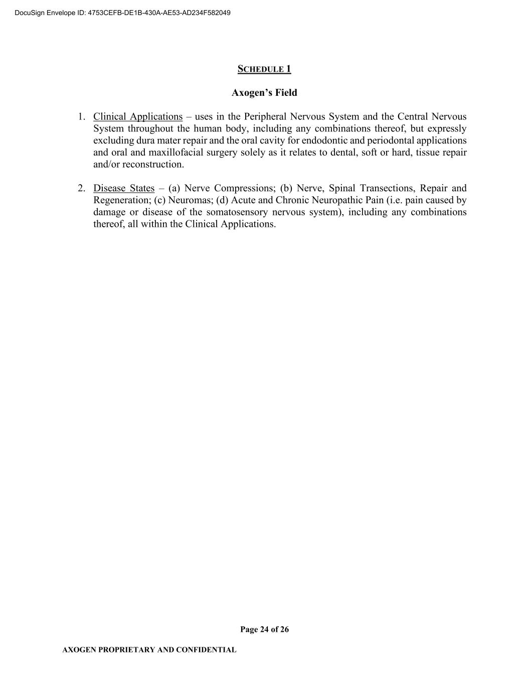 AXOGEN PROPRIETARY AND CONFIDENTIAL Page 24 of 26 SCHEDULE 1 Axogen’s Field 1. Clinical Applications – uses in the Peripheral Nervous System and the Central Nervous System throughout the human body, including any combinations thereof, but expressly excluding dura mater repair and the oral cavity for endodontic and periodontal applications and oral and maxillofacial surgery solely as it relates to dental, soft or hard, tissue repair and/or reconstruction. 2. Disease States – (a) Nerve Compressions; (b) Nerve, Spinal Transections, Repair and Regeneration; (c) Neuromas; (d) Acute and Chronic Neuropathic Pain (i.e. pain caused by damage or disease of the somatosensory nervous system), including any combinations thereof, all within the Clinical Applications. DocuSign Envelope ID: 4753CEFB-DE1B-430A-AE53-AD234F582049