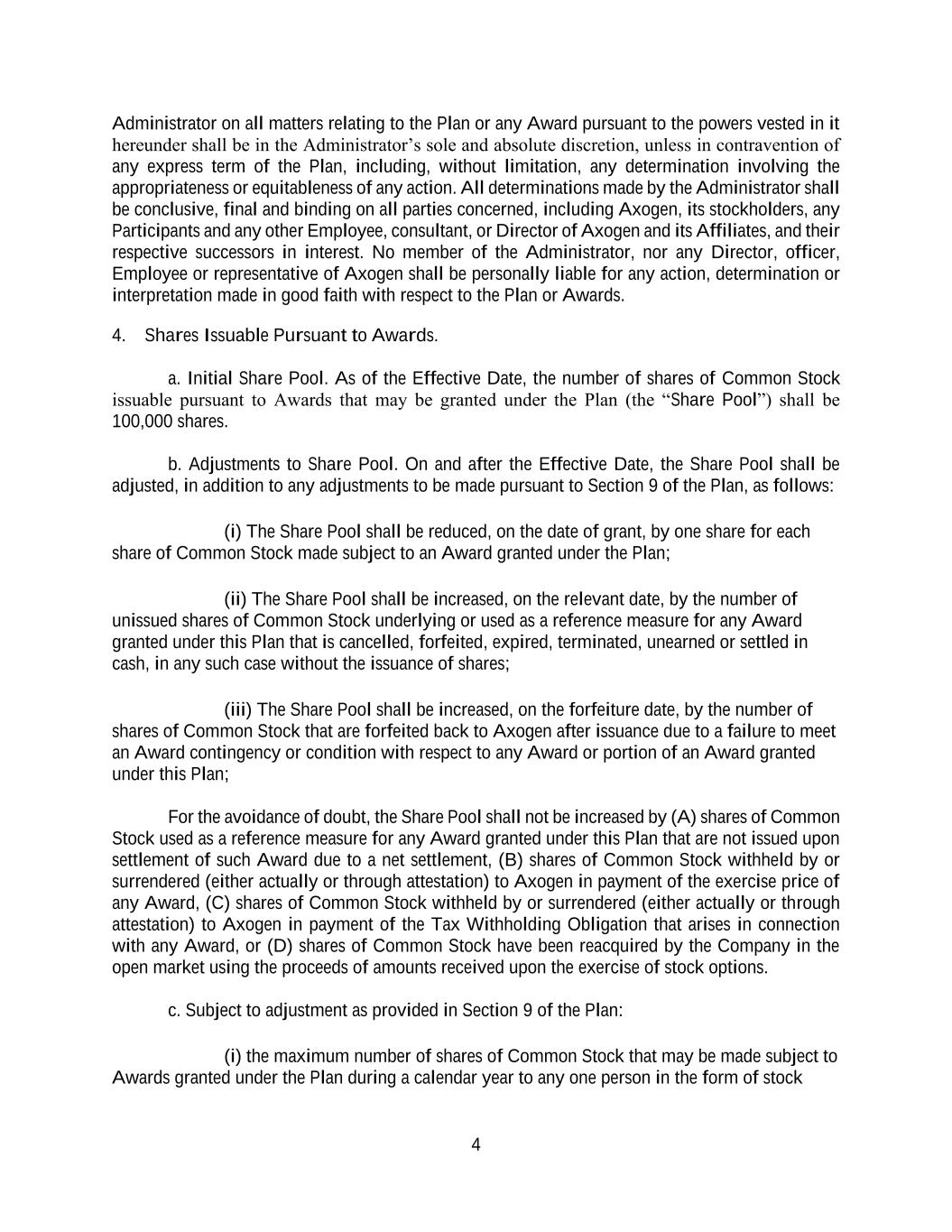 4 Administrator on all matters relating to the Plan or any Award pursuant to the powers vested in it hereunder shall be in the Administrator’s sole and absolute discretion, unless in contravention of any express term of the Plan, including, without limitation, any determination involving the appropriateness or equitableness of any action. All determinations made by the Administrator shall be conclusive, final and binding on all parties concerned, including Axogen, its stockholders, any Participants and any other Employee, consultant, or Director of Axogen and its Affiliates, and their respective successors in interest. No member of the Administrator, nor any Director, officer, Employee or representative of Axogen shall be personally liable for any action, determination or interpretation made in good faith with respect to the Plan or Awards. 4. Shares Issuable Pursuant to Awards. a. Initial Share Pool. As of the Effective Date, the number of shares of Common Stock issuable pursuant to Awards that may be granted under the Plan (the “Share Pool”) shall be 100,000 shares. b. Adjustments to Share Pool. On and after the Effective Date, the Share Pool shall be adjusted, in addition to any adjustments to be made pursuant to Section 9 of the Plan, as follows: (i) The Share Pool shall be reduced, on the date of grant, by one share for each share of Common Stock made subject to an Award granted under the Plan; (ii) The Share Pool shall be increased, on the relevant date, by the number of unissued shares of Common Stock underlying or used as a reference measure for any Award granted under this Plan that is cancelled, forfeited, expired, terminated, unearned or settled in cash, in any such case without the issuance of shares; (iii) The Share Pool shall be increased, on the forfeiture date, by the number of shares of Common Stock that are forfeited back to Axogen after issuance due to a failure to meet an Award contingency or condition with respect to any Award or portion of an Award granted under this Plan; For the avoidance of doubt, the Share Pool shall not be increased by (A) shares of Common Stock used as a reference measure for any Award granted under this Plan that are not issued upon settlement of such Award due to a net settlement, (B) shares of Common Stock withheld by or surrendered (either actually or through attestation) to Axogen in payment of the exercise price of any Award, (C) shares of Common Stock withheld by or surrendered (either actually or through attestation) to Axogen in payment of the Tax Withholding Obligation that arises in connection with any Award, or (D) shares of Common Stock have been reacquired by the Company in the open market using the proceeds of amounts received upon the exercise of stock options. c. Subject to adjustment as provided in Section 9 of the Plan: (i) the maximum number of shares of Common Stock that may be made subject to Awards granted under the Plan during a calendar year to any one person in the form of stock