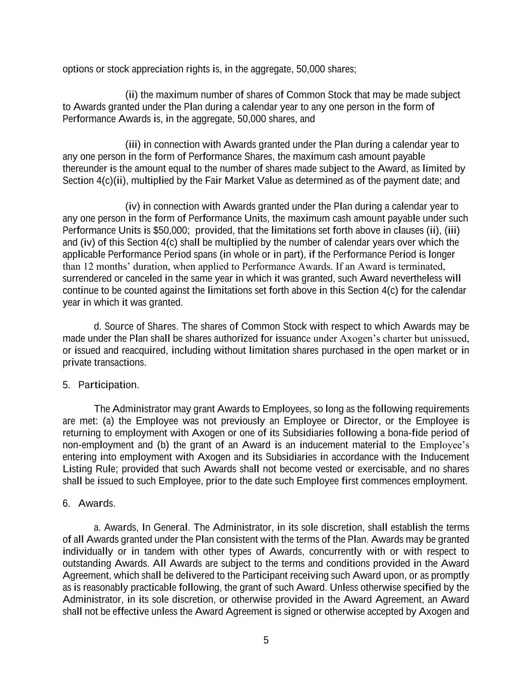 5 options or stock appreciation rights is, in the aggregate, 50,000 shares; (ii) the maximum number of shares of Common Stock that may be made subject to Awards granted under the Plan during a calendar year to any one person in the form of Performance Awards is, in the aggregate, 50,000 shares, and (iii) in connection with Awards granted under the Plan during a calendar year to any one person in the form of Performance Shares, the maximum cash amount payable thereunder is the amount equal to the number of shares made subject to the Award, as limited by Section 4(c)(ii), multiplied by the Fair Market Value as determined as of the payment date; and (iv) in connection with Awards granted under the Plan during a calendar year to any one person in the form of Performance Units, the maximum cash amount payable under such Performance Units is $50,000; provided, that the limitations set forth above in clauses (ii), (iii) and (iv) of this Section 4(c) shall be multiplied by the number of calendar years over which the applicable Performance Period spans (in whole or in part), if the Performance Period is longer than 12 months’ duration, when applied to Performance Awards. If an Award is terminated, surrendered or canceled in the same year in which it was granted, such Award nevertheless will continue to be counted against the limitations set forth above in this Section 4(c) for the calendar year in which it was granted. d. Source of Shares. The shares of Common Stock with respect to which Awards may be made under the Plan shall be shares authorized for issuance under Axogen’s charter but unissued, or issued and reacquired, including without limitation shares purchased in the open market or in private transactions. 5. Participation. The Administrator may grant Awards to Employees, so long as the following requirements are met: (a) the Employee was not previously an Employee or Director, or the Employee is returning to employment with Axogen or one of its Subsidiaries following a bona-fide period of non-employment and (b) the grant of an Award is an inducement material to the Employee’s entering into employment with Axogen and its Subsidiaries in accordance with the Inducement Listing Rule; provided that such Awards shall not become vested or exercisable, and no shares shall be issued to such Employee, prior to the date such Employee first commences employment. 6. Awards. a. Awards, In General. The Administrator, in its sole discretion, shall establish the terms of all Awards granted under the Plan consistent with the terms of the Plan. Awards may be granted individually or in tandem with other types of Awards, concurrently with or with respect to outstanding Awards. All Awards are subject to the terms and conditions provided in the Award Agreement, which shall be delivered to the Participant receiving such Award upon, or as promptly as is reasonably practicable following, the grant of such Award. Unless otherwise specified by the Administrator, in its sole discretion, or otherwise provided in the Award Agreement, an Award shall not be effective unless the Award Agreement is signed or otherwise accepted by Axogen and