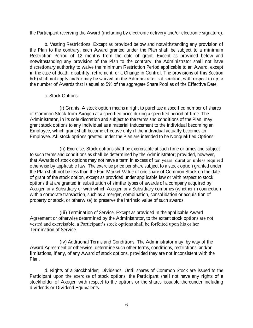 6 the Participant receiving the Award (including by electronic delivery and/or electronic signature). b. Vesting Restrictions. Except as provided below and notwithstanding any provision of the Plan to the contrary, each Award granted under the Plan shall be subject to a minimum Restriction Period of 12 months from the date of grant. Except as provided below and notwithstanding any provision of the Plan to the contrary, the Administrator shall not have discretionary authority to waive the minimum Restriction Period applicable to an Award, except in the case of death, disability, retirement, or a Change in Control. The provisions of this Section 6(b) shall not apply and/or may be waived, in the Administrator’s discretion, with respect to up to the number of Awards that is equal to 5% of the aggregate Share Pool as of the Effective Date. c. Stock Options. (i) Grants. A stock option means a right to purchase a specified number of shares of Common Stock from Axogen at a specified price during a specified period of time. The Administrator, in its sole discretion and subject to the terms and conditions of the Plan, may grant stock options to any individual as a material inducement to the individual becoming an Employee, which grant shall become effective only if the individual actually becomes an Employee. All stock options granted under the Plan are intended to be Nonqualified Options. (ii) Exercise. Stock options shall be exercisable at such time or times and subject to such terms and conditions as shall be determined by the Administrator; provided, however, that Awards of stock options may not have a term in excess of ten years’ duration unless required otherwise by applicable law. The exercise price per share subject to a stock option granted under the Plan shall not be less than the Fair Market Value of one share of Common Stock on the date of grant of the stock option, except as provided under applicable law or with respect to stock options that are granted in substitution of similar types of awards of a company acquired by Axogen or a Subsidiary or with which Axogen or a Subsidiary combines (whether in connection with a corporate transaction, such as a merger, combination, consolidation or acquisition of property or stock, or otherwise) to preserve the intrinsic value of such awards. (iii) Termination of Service. Except as provided in the applicable Award Agreement or otherwise determined by the Administrator, to the extent stock options are not vested and exercisable, a Participant’s stock options shall be forfeited upon his or her Termination of Service. (iv) Additional Terms and Conditions. The Administrator may, by way of the Award Agreement or otherwise, determine such other terms, conditions, restrictions, and/or limitations, if any, of any Award of stock options, provided they are not inconsistent with the Plan. d. Rights of a Stockholder; Dividends. Until shares of Common Stock are issued to the Participant upon the exercise of stock options, the Participant shall not have any rights of a stockholder of Axogen with respect to the options or the shares issuable thereunder including dividends or Dividend Equivalents.