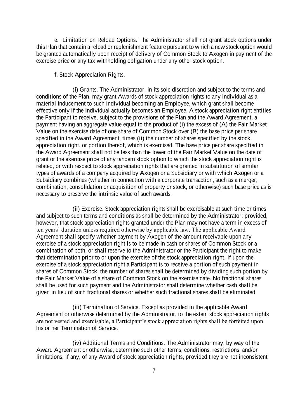 7 e. Limitation on Reload Options. The Administrator shall not grant stock options under this Plan that contain a reload or replenishment feature pursuant to which a new stock option would be granted automatically upon receipt of delivery of Common Stock to Axogen in payment of the exercise price or any tax withholding obligation under any other stock option. f. Stock Appreciation Rights. (i) Grants. The Administrator, in its sole discretion and subject to the terms and conditions of the Plan, may grant Awards of stock appreciation rights to any individual as a material inducement to such individual becoming an Employee, which grant shall become effective only if the individual actually becomes an Employee. A stock appreciation right entitles the Participant to receive, subject to the provisions of the Plan and the Award Agreement, a payment having an aggregate value equal to the product of (i) the excess of (A) the Fair Market Value on the exercise date of one share of Common Stock over (B) the base price per share specified in the Award Agreement, times (ii) the number of shares specified by the stock appreciation right, or portion thereof, which is exercised. The base price per share specified in the Award Agreement shall not be less than the lower of the Fair Market Value on the date of grant or the exercise price of any tandem stock option to which the stock appreciation right is related, or with respect to stock appreciation rights that are granted in substitution of similar types of awards of a company acquired by Axogen or a Subsidiary or with which Axogen or a Subsidiary combines (whether in connection with a corporate transaction, such as a merger, combination, consolidation or acquisition of property or stock, or otherwise) such base price as is necessary to preserve the intrinsic value of such awards. (ii) Exercise. Stock appreciation rights shall be exercisable at such time or times and subject to such terms and conditions as shall be determined by the Administrator; provided, however, that stock appreciation rights granted under the Plan may not have a term in excess of ten years’ duration unless required otherwise by applicable law. The applicable Award Agreement shall specify whether payment by Axogen of the amount receivable upon any exercise of a stock appreciation right is to be made in cash or shares of Common Stock or a combination of both, or shall reserve to the Administrator or the Participant the right to make that determination prior to or upon the exercise of the stock appreciation right. If upon the exercise of a stock appreciation right a Participant is to receive a portion of such payment in shares of Common Stock, the number of shares shall be determined by dividing such portion by the Fair Market Value of a share of Common Stock on the exercise date. No fractional shares shall be used for such payment and the Administrator shall determine whether cash shall be given in lieu of such fractional shares or whether such fractional shares shall be eliminated. (iii) Termination of Service. Except as provided in the applicable Award Agreement or otherwise determined by the Administrator, to the extent stock appreciation rights are not vested and exercisable, a Participant’s stock appreciation rights shall be forfeited upon his or her Termination of Service. (iv) Additional Terms and Conditions. The Administrator may, by way of the Award Agreement or otherwise, determine such other terms, conditions, restrictions, and/or limitations, if any, of any Award of stock appreciation rights, provided they are not inconsistent