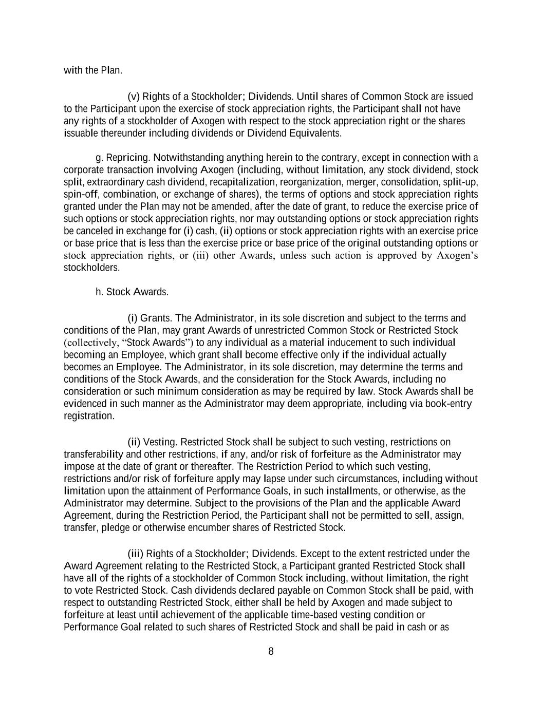 8 with the Plan. (v) Rights of a Stockholder; Dividends. Until shares of Common Stock are issued to the Participant upon the exercise of stock appreciation rights, the Participant shall not have any rights of a stockholder of Axogen with respect to the stock appreciation right or the shares issuable thereunder including dividends or Dividend Equivalents. g. Repricing. Notwithstanding anything herein to the contrary, except in connection with a corporate transaction involving Axogen (including, without limitation, any stock dividend, stock split, extraordinary cash dividend, recapitalization, reorganization, merger, consolidation, split-up, spin-off, combination, or exchange of shares), the terms of options and stock appreciation rights granted under the Plan may not be amended, after the date of grant, to reduce the exercise price of such options or stock appreciation rights, nor may outstanding options or stock appreciation rights be canceled in exchange for (i) cash, (ii) options or stock appreciation rights with an exercise price or base price that is less than the exercise price or base price of the original outstanding options or stock appreciation rights, or (iii) other Awards, unless such action is approved by Axogen’s stockholders. h. Stock Awards. (i) Grants. The Administrator, in its sole discretion and subject to the terms and conditions of the Plan, may grant Awards of unrestricted Common Stock or Restricted Stock (collectively, “Stock Awards”) to any individual as a material inducement to such individual becoming an Employee, which grant shall become effective only if the individual actually becomes an Employee. The Administrator, in its sole discretion, may determine the terms and conditions of the Stock Awards, and the consideration for the Stock Awards, including no consideration or such minimum consideration as may be required by law. Stock Awards shall be evidenced in such manner as the Administrator may deem appropriate, including via book-entry registration. (ii) Vesting. Restricted Stock shall be subject to such vesting, restrictions on transferability and other restrictions, if any, and/or risk of forfeiture as the Administrator may impose at the date of grant or thereafter. The Restriction Period to which such vesting, restrictions and/or risk of forfeiture apply may lapse under such circumstances, including without limitation upon the attainment of Performance Goals, in such installments, or otherwise, as the Administrator may determine. Subject to the provisions of the Plan and the applicable Award Agreement, during the Restriction Period, the Participant shall not be permitted to sell, assign, transfer, pledge or otherwise encumber shares of Restricted Stock. (iii) Rights of a Stockholder; Dividends. Except to the extent restricted under the Award Agreement relating to the Restricted Stock, a Participant granted Restricted Stock shall have all of the rights of a stockholder of Common Stock including, without limitation, the right to vote Restricted Stock. Cash dividends declared payable on Common Stock shall be paid, with respect to outstanding Restricted Stock, either shall be held by Axogen and made subject to forfeiture at least until achievement of the applicable time-based vesting condition or Performance Goal related to such shares of Restricted Stock and shall be paid in cash or as