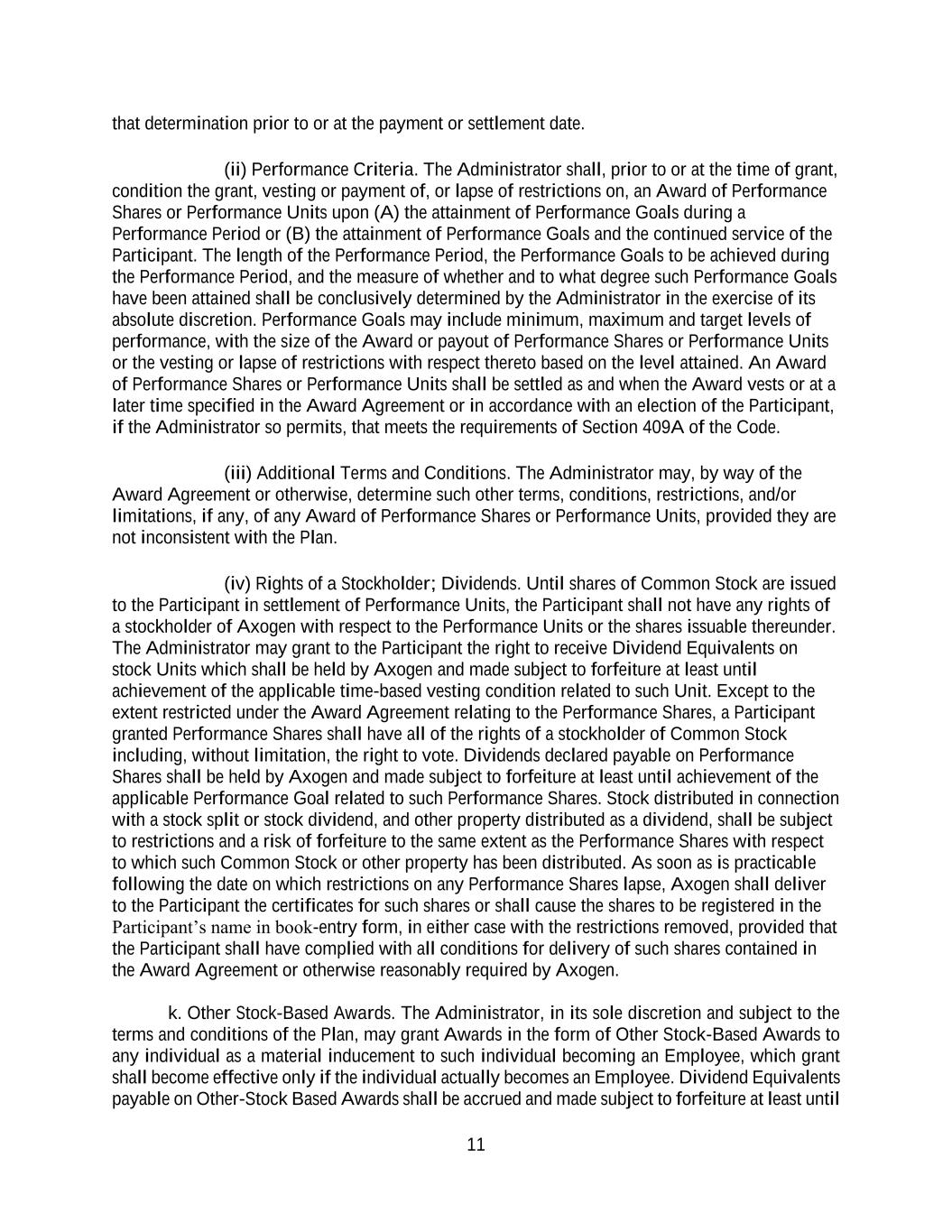 11 that determination prior to or at the payment or settlement date. (ii) Performance Criteria. The Administrator shall, prior to or at the time of grant, condition the grant, vesting or payment of, or lapse of restrictions on, an Award of Performance Shares or Performance Units upon (A) the attainment of Performance Goals during a Performance Period or (B) the attainment of Performance Goals and the continued service of the Participant. The length of the Performance Period, the Performance Goals to be achieved during the Performance Period, and the measure of whether and to what degree such Performance Goals have been attained shall be conclusively determined by the Administrator in the exercise of its absolute discretion. Performance Goals may include minimum, maximum and target levels of performance, with the size of the Award or payout of Performance Shares or Performance Units or the vesting or lapse of restrictions with respect thereto based on the level attained. An Award of Performance Shares or Performance Units shall be settled as and when the Award vests or at a later time specified in the Award Agreement or in accordance with an election of the Participant, if the Administrator so permits, that meets the requirements of Section 409A of the Code. (iii) Additional Terms and Conditions. The Administrator may, by way of the Award Agreement or otherwise, determine such other terms, conditions, restrictions, and/or limitations, if any, of any Award of Performance Shares or Performance Units, provided they are not inconsistent with the Plan. (iv) Rights of a Stockholder; Dividends. Until shares of Common Stock are issued to the Participant in settlement of Performance Units, the Participant shall not have any rights of a stockholder of Axogen with respect to the Performance Units or the shares issuable thereunder. The Administrator may grant to the Participant the right to receive Dividend Equivalents on stock Units which shall be held by Axogen and made subject to forfeiture at least until achievement of the applicable time-based vesting condition related to such Unit. Except to the extent restricted under the Award Agreement relating to the Performance Shares, a Participant granted Performance Shares shall have all of the rights of a stockholder of Common Stock including, without limitation, the right to vote. Dividends declared payable on Performance Shares shall be held by Axogen and made subject to forfeiture at least until achievement of the applicable Performance Goal related to such Performance Shares. Stock distributed in connection with a stock split or stock dividend, and other property distributed as a dividend, shall be subject to restrictions and a risk of forfeiture to the same extent as the Performance Shares with respect to which such Common Stock or other property has been distributed. As soon as is practicable following the date on which restrictions on any Performance Shares lapse, Axogen shall deliver to the Participant the certificates for such shares or shall cause the shares to be registered in the Participant’s name in book-entry form, in either case with the restrictions removed, provided that the Participant shall have complied with all conditions for delivery of such shares contained in the Award Agreement or otherwise reasonably required by Axogen. k. Other Stock-Based Awards. The Administrator, in its sole discretion and subject to the terms and conditions of the Plan, may grant Awards in the form of Other Stock-Based Awards to any individual as a material inducement to such individual becoming an Employee, which grant shall become effective only if the individual actually becomes an Employee. Dividend Equivalents payable on Other-Stock Based Awards shall be accrued and made subject to forfeiture at least until