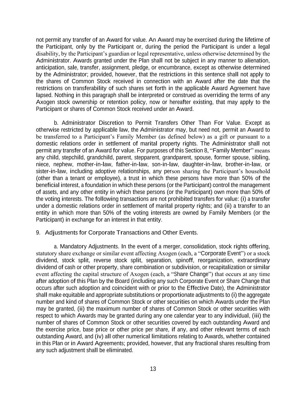 13 not permit any transfer of an Award for value. An Award may be exercised during the lifetime of the Participant, only by the Participant or, during the period the Participant is under a legal disability, by the Participant’s guardian or legal representative, unless otherwise determined by the Administrator. Awards granted under the Plan shall not be subject in any manner to alienation, anticipation, sale, transfer, assignment, pledge, or encumbrance, except as otherwise determined by the Administrator; provided, however, that the restrictions in this sentence shall not apply to the shares of Common Stock received in connection with an Award after the date that the restrictions on transferability of such shares set forth in the applicable Award Agreement have lapsed. Nothing in this paragraph shall be interpreted or construed as overriding the terms of any Axogen stock ownership or retention policy, now or hereafter existing, that may apply to the Participant or shares of Common Stock received under an Award. b. Administrator Discretion to Permit Transfers Other Than For Value. Except as otherwise restricted by applicable law, the Administrator may, but need not, permit an Award to be transferred to a Participant’s Family Member (as defined below) as a gift or pursuant to a domestic relations order in settlement of marital property rights. The Administrator shall not permit any transfer of an Award for value. For purposes of this Section 8, “Family Member” means any child, stepchild, grandchild, parent, stepparent, grandparent, spouse, former spouse, sibling, niece, nephew, mother-in-law, father-in-law, son-in-law, daughter-in-law, brother-in-law, or sister-in-law, including adoptive relationships, any person sharing the Participant’s household (other than a tenant or employee), a trust in which these persons have more than 50% of the beneficial interest, a foundation in which these persons (or the Participant) control the management of assets, and any other entity in which these persons (or the Participant) own more than 50% of the voting interests. The following transactions are not prohibited transfers for value: (i) a transfer under a domestic relations order in settlement of marital property rights; and (ii) a transfer to an entity in which more than 50% of the voting interests are owned by Family Members (or the Participant) in exchange for an interest in that entity. 9. Adjustments for Corporate Transactions and Other Events. a. Mandatory Adjustments. In the event of a merger, consolidation, stock rights offering, statutory share exchange or similar event affecting Axogen (each, a “Corporate Event”) or a stock dividend, stock split, reverse stock split, separation, spinoff, reorganization, extraordinary dividend of cash or other property, share combination or subdivision, or recapitalization or similar event affecting the capital structure of Axogen (each, a “Share Change”) that occurs at any time after adoption of this Plan by the Board (including any such Corporate Event or Share Change that occurs after such adoption and coincident with or prior to the Effective Date), the Administrator shall make equitable and appropriate substitutions or proportionate adjustments to (i) the aggregate number and kind of shares of Common Stock or other securities on which Awards under the Plan may be granted, (ii) the maximum number of shares of Common Stock or other securities with respect to which Awards may be granted during any one calendar year to any individual, (iii) the number of shares of Common Stock or other securities covered by each outstanding Award and the exercise price, base price or other price per share, if any, and other relevant terms of each outstanding Award, and (iv) all other numerical limitations relating to Awards, whether contained in this Plan or in Award Agreements; provided, however, that any fractional shares resulting from any such adjustment shall be eliminated.