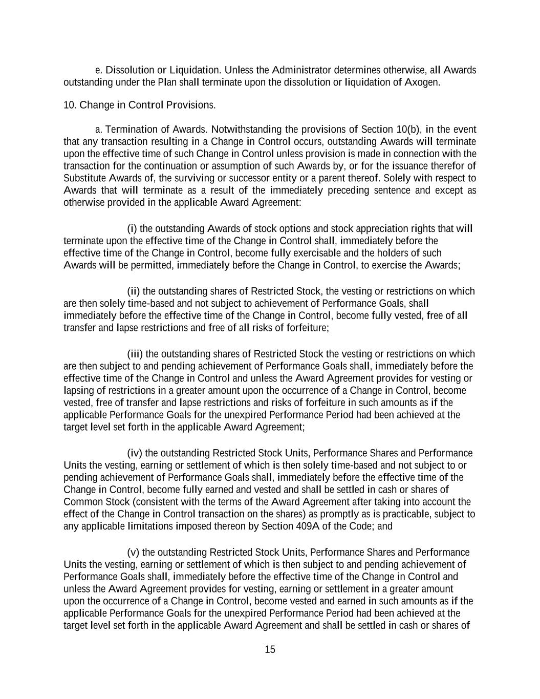 15 e. Dissolution or Liquidation. Unless the Administrator determines otherwise, all Awards outstanding under the Plan shall terminate upon the dissolution or liquidation of Axogen. 10. Change in Control Provisions. a. Termination of Awards. Notwithstanding the provisions of Section 10(b), in the event that any transaction resulting in a Change in Control occurs, outstanding Awards will terminate upon the effective time of such Change in Control unless provision is made in connection with the transaction for the continuation or assumption of such Awards by, or for the issuance therefor of Substitute Awards of, the surviving or successor entity or a parent thereof. Solely with respect to Awards that will terminate as a result of the immediately preceding sentence and except as otherwise provided in the applicable Award Agreement: (i) the outstanding Awards of stock options and stock appreciation rights that will terminate upon the effective time of the Change in Control shall, immediately before the effective time of the Change in Control, become fully exercisable and the holders of such Awards will be permitted, immediately before the Change in Control, to exercise the Awards; (ii) the outstanding shares of Restricted Stock, the vesting or restrictions on which are then solely time-based and not subject to achievement of Performance Goals, shall immediately before the effective time of the Change in Control, become fully vested, free of all transfer and lapse restrictions and free of all risks of forfeiture; (iii) the outstanding shares of Restricted Stock the vesting or restrictions on which are then subject to and pending achievement of Performance Goals shall, immediately before the effective time of the Change in Control and unless the Award Agreement provides for vesting or lapsing of restrictions in a greater amount upon the occurrence of a Change in Control, become vested, free of transfer and lapse restrictions and risks of forfeiture in such amounts as if the applicable Performance Goals for the unexpired Performance Period had been achieved at the target level set forth in the applicable Award Agreement; (iv) the outstanding Restricted Stock Units, Performance Shares and Performance Units the vesting, earning or settlement of which is then solely time-based and not subject to or pending achievement of Performance Goals shall, immediately before the effective time of the Change in Control, become fully earned and vested and shall be settled in cash or shares of Common Stock (consistent with the terms of the Award Agreement after taking into account the effect of the Change in Control transaction on the shares) as promptly as is practicable, subject to any applicable limitations imposed thereon by Section 409A of the Code; and (v) the outstanding Restricted Stock Units, Performance Shares and Performance Units the vesting, earning or settlement of which is then subject to and pending achievement of Performance Goals shall, immediately before the effective time of the Change in Control and unless the Award Agreement provides for vesting, earning or settlement in a greater amount upon the occurrence of a Change in Control, become vested and earned in such amounts as if the applicable Performance Goals for the unexpired Performance Period had been achieved at the target level set forth in the applicable Award Agreement and shall be settled in cash or shares of