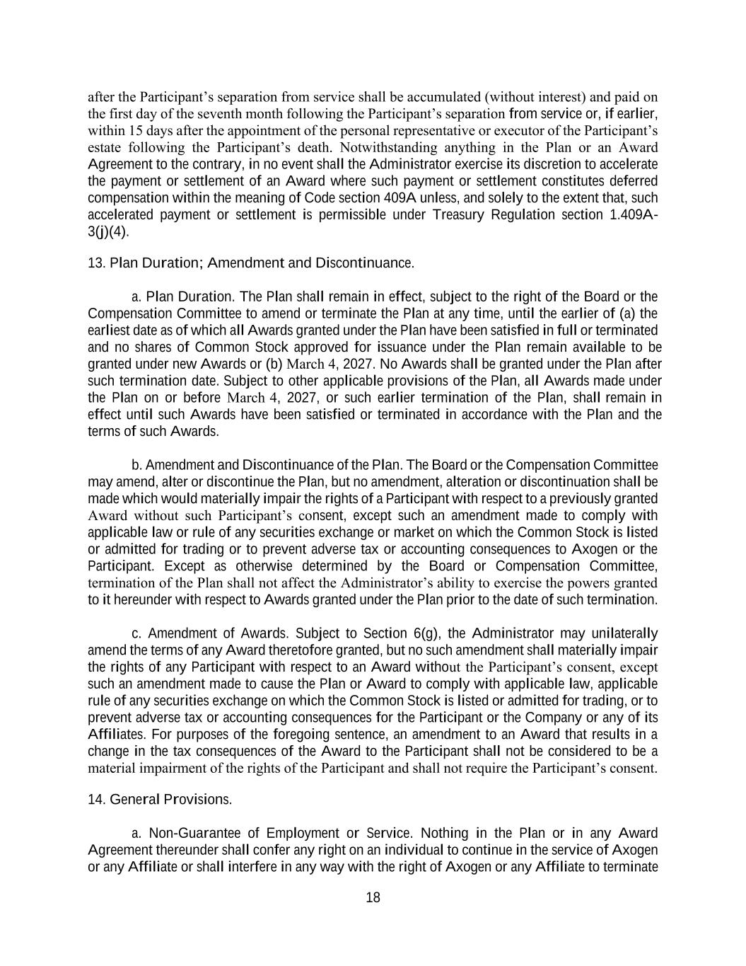 18 after the Participant’s separation from service shall be accumulated (without interest) and paid on the first day of the seventh month following the Participant’s separation from service or, if earlier, within 15 days after the appointment of the personal representative or executor of the Participant’s estate following the Participant’s death. Notwithstanding anything in the Plan or an Award Agreement to the contrary, in no event shall the Administrator exercise its discretion to accelerate the payment or settlement of an Award where such payment or settlement constitutes deferred compensation within the meaning of Code section 409A unless, and solely to the extent that, such accelerated payment or settlement is permissible under Treasury Regulation section 1.409A- 3(j)(4). 13. Plan Duration; Amendment and Discontinuance. a. Plan Duration. The Plan shall remain in effect, subject to the right of the Board or the Compensation Committee to amend or terminate the Plan at any time, until the earlier of (a) the earliest date as of which all Awards granted under the Plan have been satisfied in full or terminated and no shares of Common Stock approved for issuance under the Plan remain available to be granted under new Awards or (b) March 4, 2027. No Awards shall be granted under the Plan after such termination date. Subject to other applicable provisions of the Plan, all Awards made under the Plan on or before March 4, 2027, or such earlier termination of the Plan, shall remain in effect until such Awards have been satisfied or terminated in accordance with the Plan and the terms of such Awards. b. Amendment and Discontinuance of the Plan. The Board or the Compensation Committee may amend, alter or discontinue the Plan, but no amendment, alteration or discontinuation shall be made which would materially impair the rights of a Participant with respect to a previously granted Award without such Participant’s consent, except such an amendment made to comply with applicable law or rule of any securities exchange or market on which the Common Stock is listed or admitted for trading or to prevent adverse tax or accounting consequences to Axogen or the Participant. Except as otherwise determined by the Board or Compensation Committee, termination of the Plan shall not affect the Administrator’s ability to exercise the powers granted to it hereunder with respect to Awards granted under the Plan prior to the date of such termination. c. Amendment of Awards. Subject to Section 6(g), the Administrator may unilaterally amend the terms of any Award theretofore granted, but no such amendment shall materially impair the rights of any Participant with respect to an Award without the Participant’s consent, except such an amendment made to cause the Plan or Award to comply with applicable law, applicable rule of any securities exchange on which the Common Stock is listed or admitted for trading, or to prevent adverse tax or accounting consequences for the Participant or the Company or any of its Affiliates. For purposes of the foregoing sentence, an amendment to an Award that results in a change in the tax consequences of the Award to the Participant shall not be considered to be a material impairment of the rights of the Participant and shall not require the Participant’s consent. 14. General Provisions. a. Non-Guarantee of Employment or Service. Nothing in the Plan or in any Award Agreement thereunder shall confer any right on an individual to continue in the service of Axogen or any Affiliate or shall interfere in any way with the right of Axogen or any Affiliate to terminate