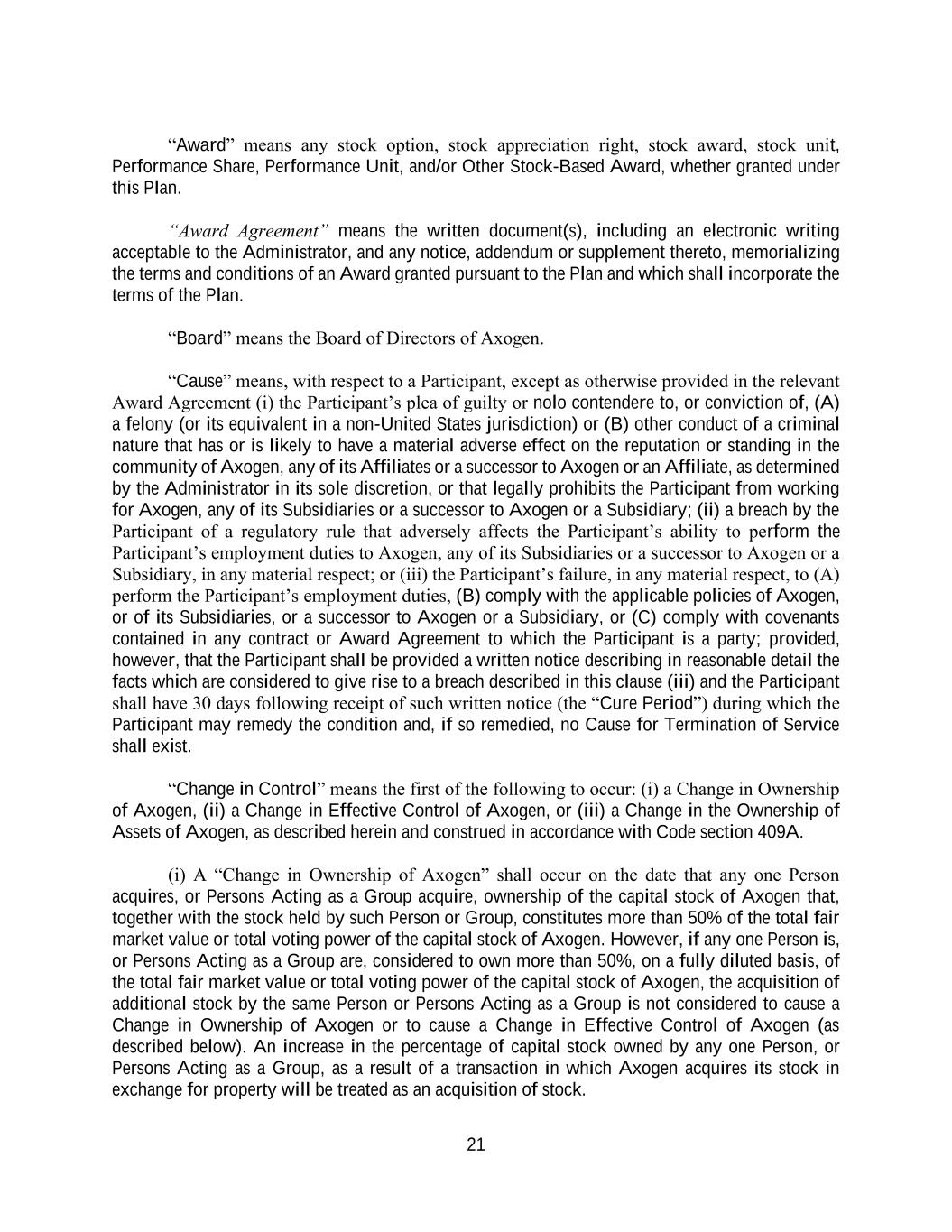 21 “Award” means any stock option, stock appreciation right, stock award, stock unit, Performance Share, Performance Unit, and/or Other Stock-Based Award, whether granted under this Plan. “Award Agreement” means the written document(s), including an electronic writing acceptable to the Administrator, and any notice, addendum or supplement thereto, memorializing the terms and conditions of an Award granted pursuant to the Plan and which shall incorporate the terms of the Plan. “Board” means the Board of Directors of Axogen. “Cause” means, with respect to a Participant, except as otherwise provided in the relevant Award Agreement (i) the Participant’s plea of guilty or nolo contendere to, or conviction of, (A) a felony (or its equivalent in a non-United States jurisdiction) or (B) other conduct of a criminal nature that has or is likely to have a material adverse effect on the reputation or standing in the community of Axogen, any of its Affiliates or a successor to Axogen or an Affiliate, as determined by the Administrator in its sole discretion, or that legally prohibits the Participant from working for Axogen, any of its Subsidiaries or a successor to Axogen or a Subsidiary; (ii) a breach by the Participant of a regulatory rule that adversely affects the Participant’s ability to perform the Participant’s employment duties to Axogen, any of its Subsidiaries or a successor to Axogen or a Subsidiary, in any material respect; or (iii) the Participant’s failure, in any material respect, to (A) perform the Participant’s employment duties, (B) comply with the applicable policies of Axogen, or of its Subsidiaries, or a successor to Axogen or a Subsidiary, or (C) comply with covenants contained in any contract or Award Agreement to which the Participant is a party; provided, however, that the Participant shall be provided a written notice describing in reasonable detail the facts which are considered to give rise to a breach described in this clause (iii) and the Participant shall have 30 days following receipt of such written notice (the “Cure Period”) during which the Participant may remedy the condition and, if so remedied, no Cause for Termination of Service shall exist. “Change in Control” means the first of the following to occur: (i) a Change in Ownership of Axogen, (ii) a Change in Effective Control of Axogen, or (iii) a Change in the Ownership of Assets of Axogen, as described herein and construed in accordance with Code section 409A. (i) A “Change in Ownership of Axogen” shall occur on the date that any one Person acquires, or Persons Acting as a Group acquire, ownership of the capital stock of Axogen that, together with the stock held by such Person or Group, constitutes more than 50% of the total fair market value or total voting power of the capital stock of Axogen. However, if any one Person is, or Persons Acting as a Group are, considered to own more than 50%, on a fully diluted basis, of the total fair market value or total voting power of the capital stock of Axogen, the acquisition of additional stock by the same Person or Persons Acting as a Group is not considered to cause a Change in Ownership of Axogen or to cause a Change in Effective Control of Axogen (as described below). An increase in the percentage of capital stock owned by any one Person, or Persons Acting as a Group, as a result of a transaction in which Axogen acquires its stock in exchange for property will be treated as an acquisition of stock.