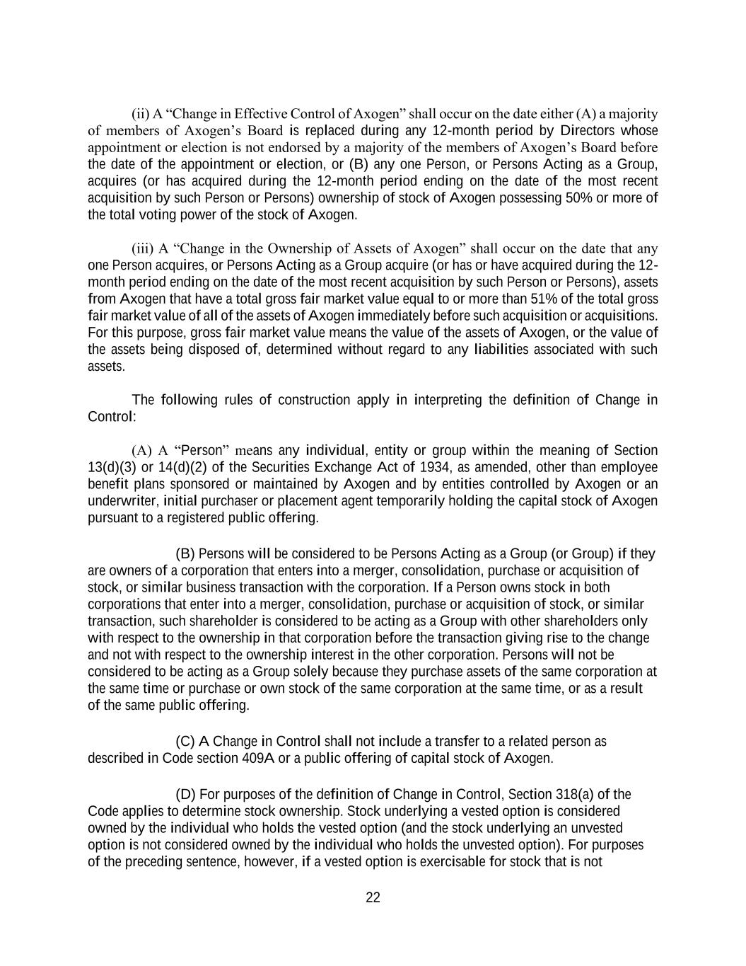 22 (ii) A “Change in Effective Control of Axogen” shall occur on the date either (A) a majority of members of Axogen’s Board is replaced during any 12-month period by Directors whose appointment or election is not endorsed by a majority of the members of Axogen’s Board before the date of the appointment or election, or (B) any one Person, or Persons Acting as a Group, acquires (or has acquired during the 12-month period ending on the date of the most recent acquisition by such Person or Persons) ownership of stock of Axogen possessing 50% or more of the total voting power of the stock of Axogen. (iii) A “Change in the Ownership of Assets of Axogen” shall occur on the date that any one Person acquires, or Persons Acting as a Group acquire (or has or have acquired during the 12- month period ending on the date of the most recent acquisition by such Person or Persons), assets from Axogen that have a total gross fair market value equal to or more than 51% of the total gross fair market value of all of the assets of Axogen immediately before such acquisition or acquisitions. For this purpose, gross fair market value means the value of the assets of Axogen, or the value of the assets being disposed of, determined without regard to any liabilities associated with such assets. The following rules of construction apply in interpreting the definition of Change in Control: (A) A “Person” means any individual, entity or group within the meaning of Section 13(d)(3) or 14(d)(2) of the Securities Exchange Act of 1934, as amended, other than employee benefit plans sponsored or maintained by Axogen and by entities controlled by Axogen or an underwriter, initial purchaser or placement agent temporarily holding the capital stock of Axogen pursuant to a registered public offering. (B) Persons will be considered to be Persons Acting as a Group (or Group) if they are owners of a corporation that enters into a merger, consolidation, purchase or acquisition of stock, or similar business transaction with the corporation. If a Person owns stock in both corporations that enter into a merger, consolidation, purchase or acquisition of stock, or similar transaction, such shareholder is considered to be acting as a Group with other shareholders only with respect to the ownership in that corporation before the transaction giving rise to the change and not with respect to the ownership interest in the other corporation. Persons will not be considered to be acting as a Group solely because they purchase assets of the same corporation at the same time or purchase or own stock of the same corporation at the same time, or as a result of the same public offering. (C) A Change in Control shall not include a transfer to a related person as described in Code section 409A or a public offering of capital stock of Axogen. (D) For purposes of the definition of Change in Control, Section 318(a) of the Code applies to determine stock ownership. Stock underlying a vested option is considered owned by the individual who holds the vested option (and the stock underlying an unvested option is not considered owned by the individual who holds the unvested option). For purposes of the preceding sentence, however, if a vested option is exercisable for stock that is not