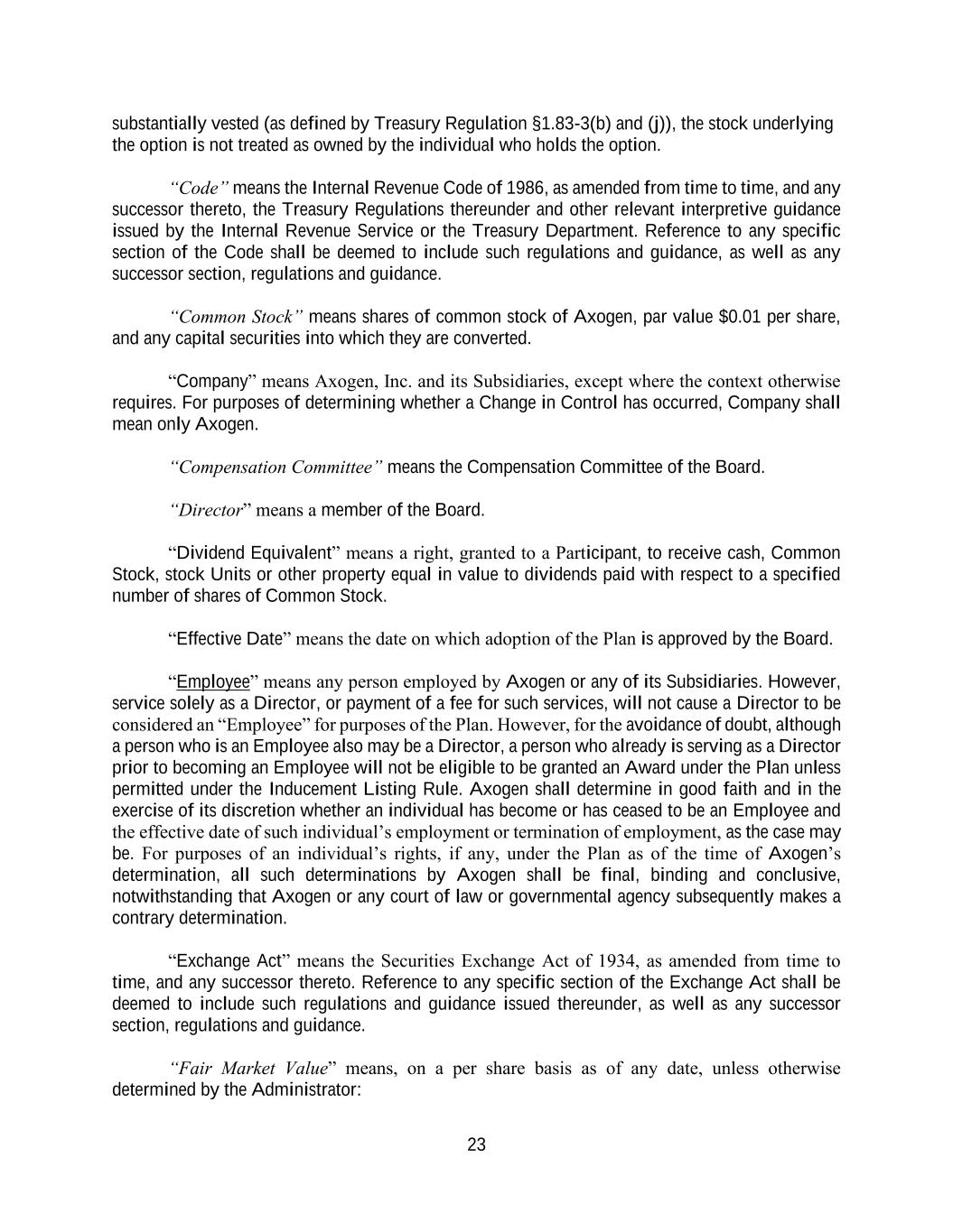 23 substantially vested (as defined by Treasury Regulation §1.83-3(b) and (j)), the stock underlying the option is not treated as owned by the individual who holds the option. “Code” means the Internal Revenue Code of 1986, as amended from time to time, and any successor thereto, the Treasury Regulations thereunder and other relevant interpretive guidance issued by the Internal Revenue Service or the Treasury Department. Reference to any specific section of the Code shall be deemed to include such regulations and guidance, as well as any successor section, regulations and guidance. “Common Stock” means shares of common stock of Axogen, par value $0.01 per share, and any capital securities into which they are converted. “Company” means Axogen, Inc. and its Subsidiaries, except where the context otherwise requires. For purposes of determining whether a Change in Control has occurred, Company shall mean only Axogen. “Compensation Committee” means the Compensation Committee of the Board. “Director” means a member of the Board. “Dividend Equivalent” means a right, granted to a Participant, to receive cash, Common Stock, stock Units or other property equal in value to dividends paid with respect to a specified number of shares of Common Stock. “Effective Date” means the date on which adoption of the Plan is approved by the Board. “Employee” means any person employed by Axogen or any of its Subsidiaries. However, service solely as a Director, or payment of a fee for such services, will not cause a Director to be considered an “Employee” for purposes of the Plan. However, for the avoidance of doubt, although a person who is an Employee also may be a Director, a person who already is serving as a Director prior to becoming an Employee will not be eligible to be granted an Award under the Plan unless permitted under the Inducement Listing Rule. Axogen shall determine in good faith and in the exercise of its discretion whether an individual has become or has ceased to be an Employee and the effective date of such individual’s employment or termination of employment, as the case may be. For purposes of an individual’s rights, if any, under the Plan as of the time of Axogen’s determination, all such determinations by Axogen shall be final, binding and conclusive, notwithstanding that Axogen or any court of law or governmental agency subsequently makes a contrary determination. “Exchange Act” means the Securities Exchange Act of 1934, as amended from time to time, and any successor thereto. Reference to any specific section of the Exchange Act shall be deemed to include such regulations and guidance issued thereunder, as well as any successor section, regulations and guidance. “Fair Market Value” means, on a per share basis as of any date, unless otherwise determined by the Administrator: